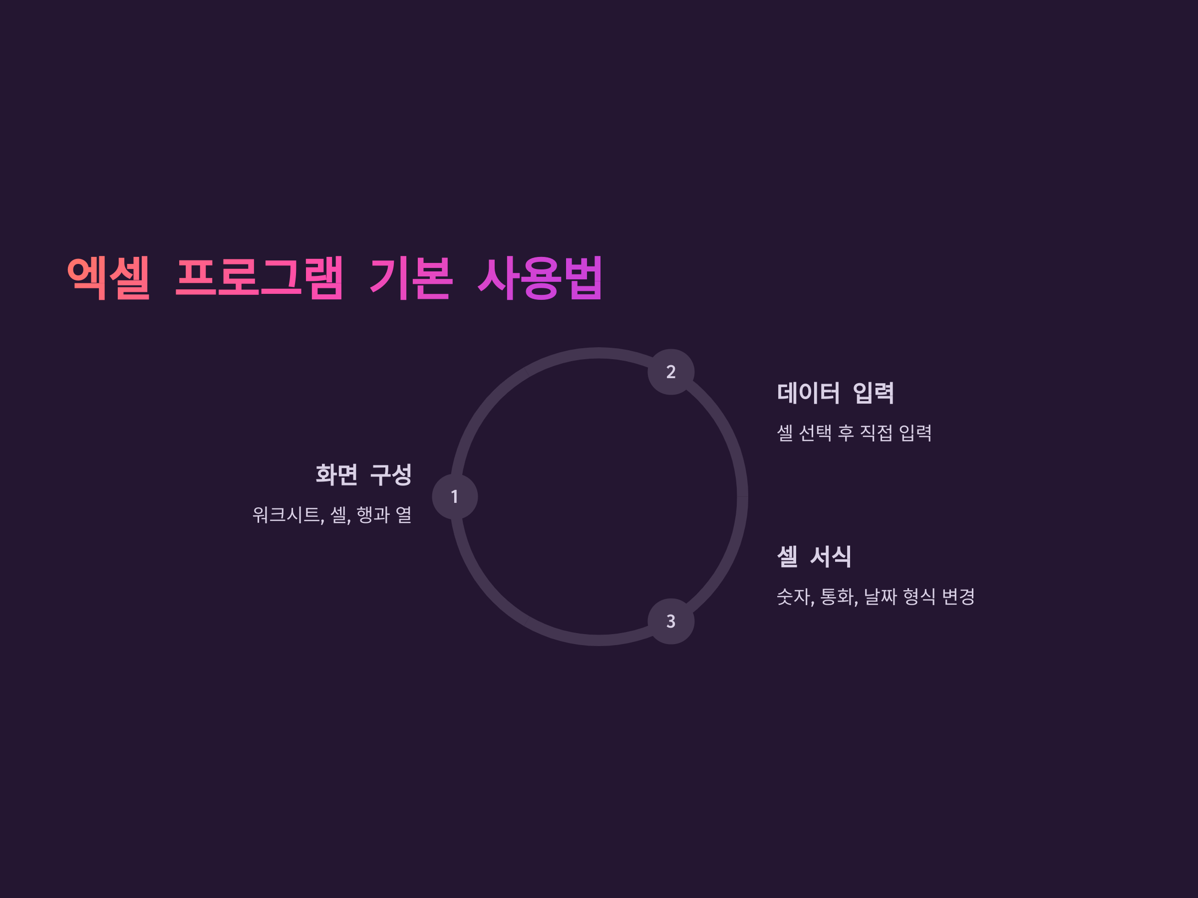 엑셀의 화면은 워크시트로 구성되어 있으며, 각 워크시트는 셀(cell)로 나누어져 있습니다. 각 셀은 행과 열로 구분되며, 데이터를 입력하거나 계산식을 입력할 수 있습니다. 엑셀에서는 기본적으로 숫자, 날짜, 텍스트 등 다양한 유형의 데이터를 다룰 수 있습니다.