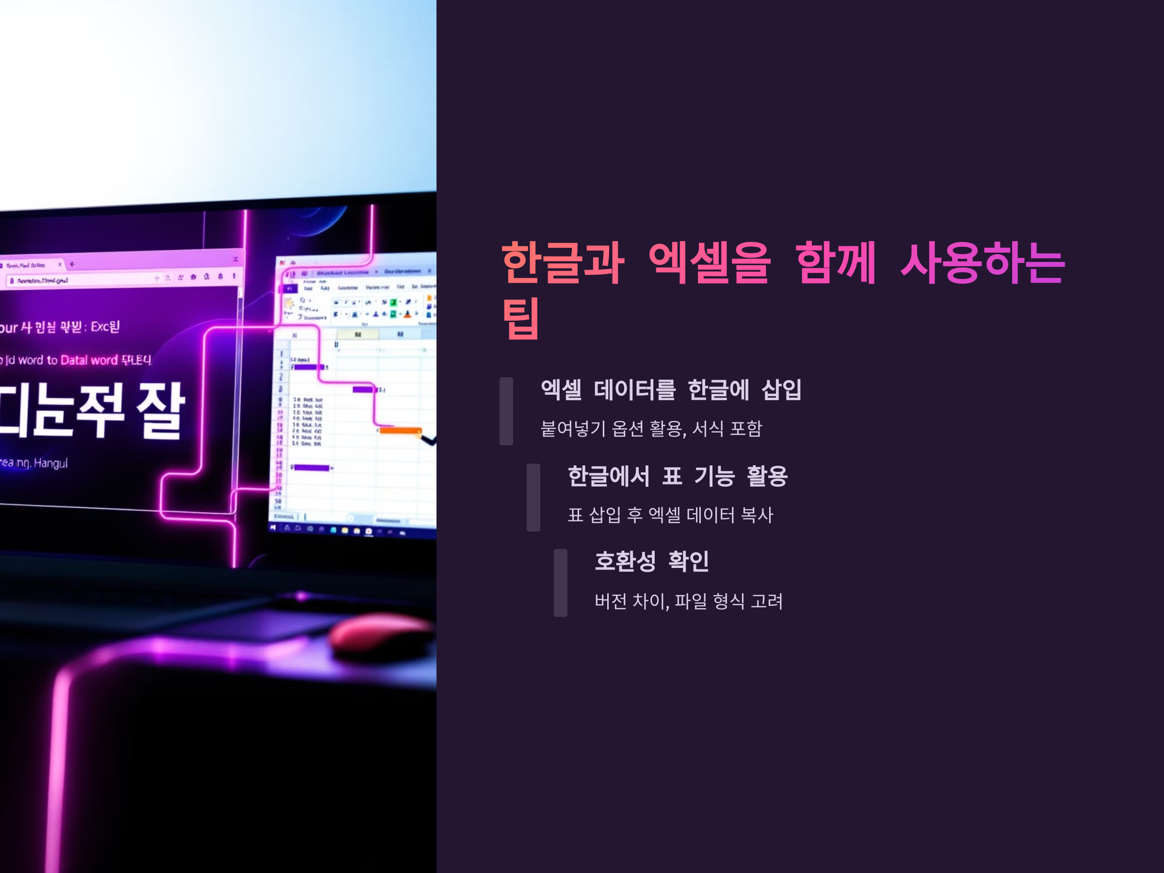한글과 엑셀을 함께 사용할 때는 두 프로그램 간의 데이터 호환성을 잘 파악하고 활용하는 것이 중요합니다. 예를 들어, 엑셀에서 계산한 데이터를 한글로 복사하여 붙여넣을 때 유용한 팁들을 소개합니다.
