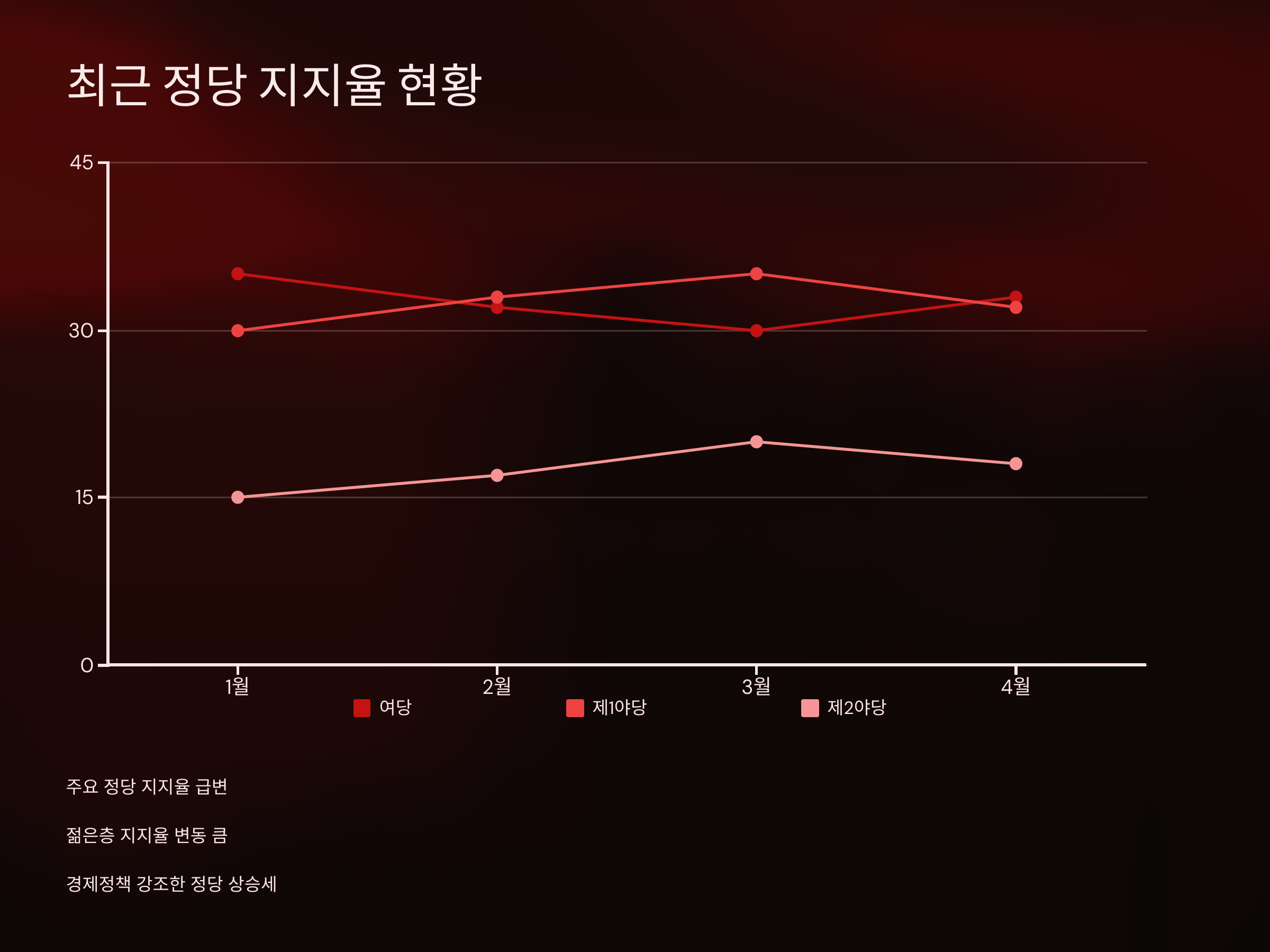 최근 여론조사 결과에 따르면, 주요 정당의 지지율이 급변하고 있는 것으로 나타났습니다. 특정 정당이 강세를 보이다가도 각종 정치적 이슈나 외부 요인에 의해 지지율이 요동치는 모습입니다. 특히, 젊은 층의 지지율 변동이 크며, 이들의 투표 참여율이 이번 총선의 핵심 변수가 될 가능성이 큽니다.