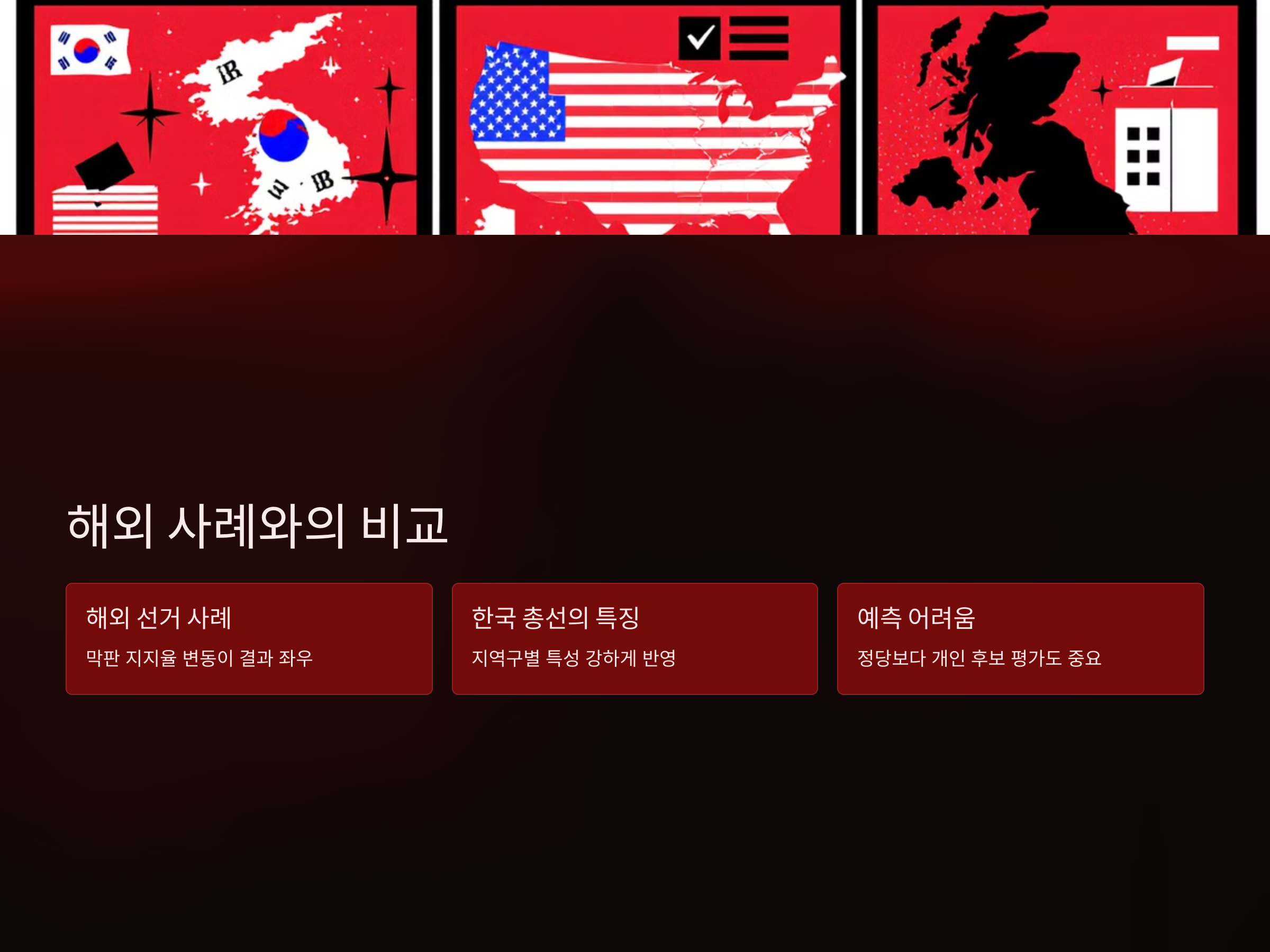 한국의 총선은 단순히 정당 간 경쟁이 아니라 지역구별 특성이 강하게 반영된다는 점에서 해외와 차이가 있습니다. 또한, 정당보다는 개인 후보에 대한 평가가 중요한 경우도 많아, 유권자들의 최종 선택이 예측하기 어려운 특징이 있습니다.
