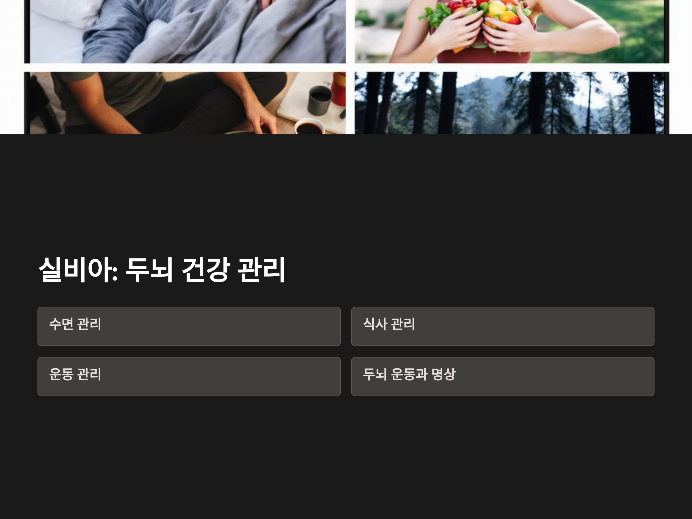 실비아는 치매 예방을 위해 수면, 식사, 운동 등 생활습관을 관리하고, 전문가와 세운 목표를 달성하며 두뇌 운동과 명상으로 두뇌를 건강하게 관리하는 앱입니다. citeturn0search8