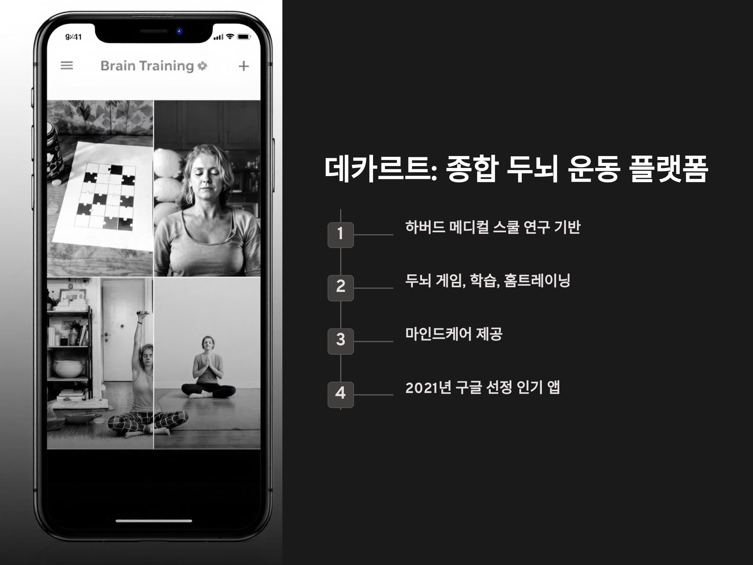 데카르트는 하버드 메디컬 스쿨의 연구를 기반으로 두뇌 게임, 학습, 홈트레이닝, 마인드케어 등 다양한 뇌 운동을 즐길 수 있는 앱으로, 출시 1년 만에 구글 선정 2021년을 빛낸 인기 앱에 선정되기도 했습니다. citeturn0search11