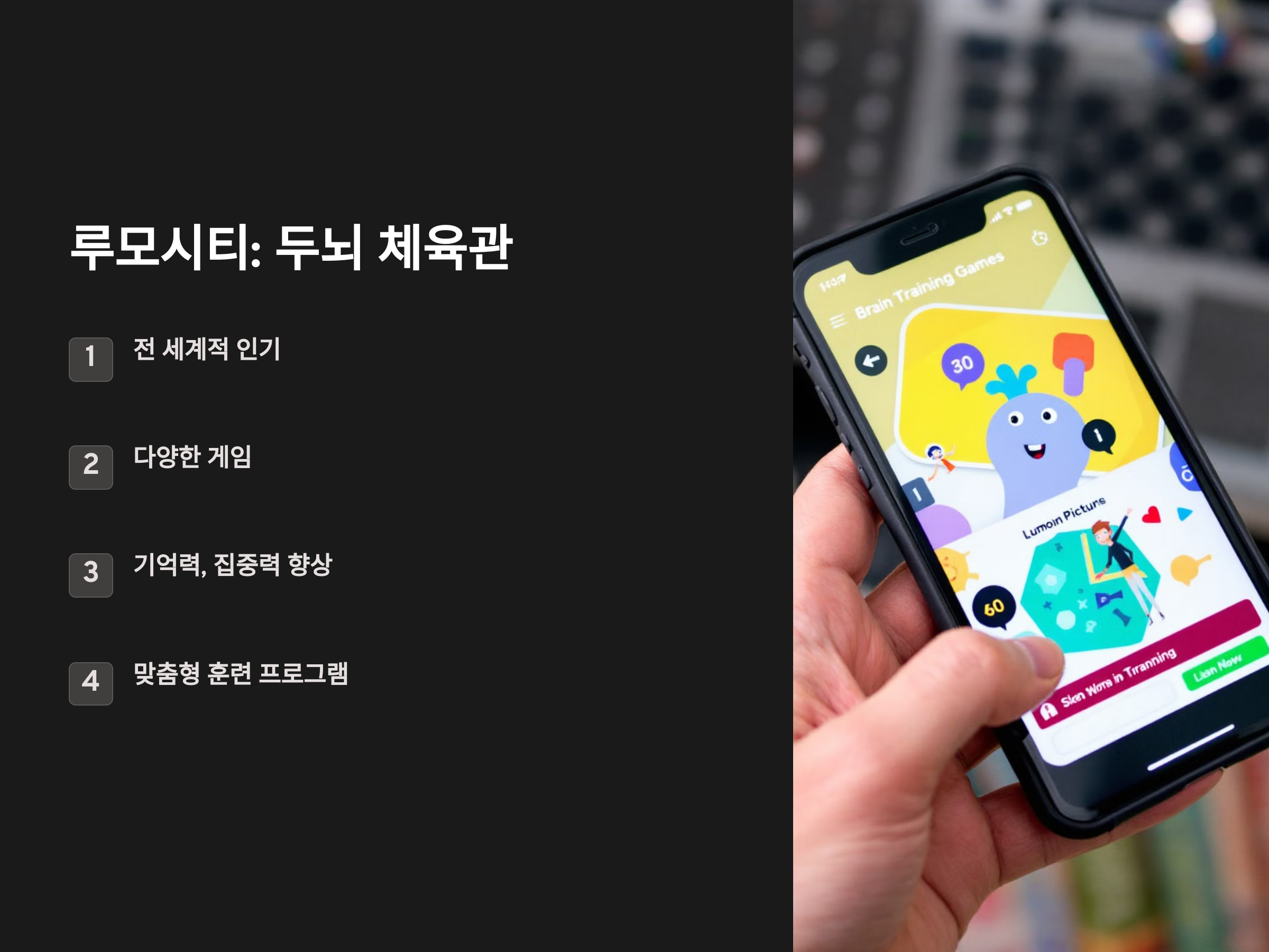 루모시티는 전 세계적으로 널리 사용되는 두뇌 훈련 앱 중 하나로, 다양한 게임을 통해 기억력, 집중력, 문제 해결 능력 등을 향상시킬 수 있습니다. 뇌과학 연구를 바탕으로 개발된 맞춤형 훈련 프로그램은 사용자의 인지 능력을 효과적으로 향상시키는 데 도움을 줍니다. citeturn0search1