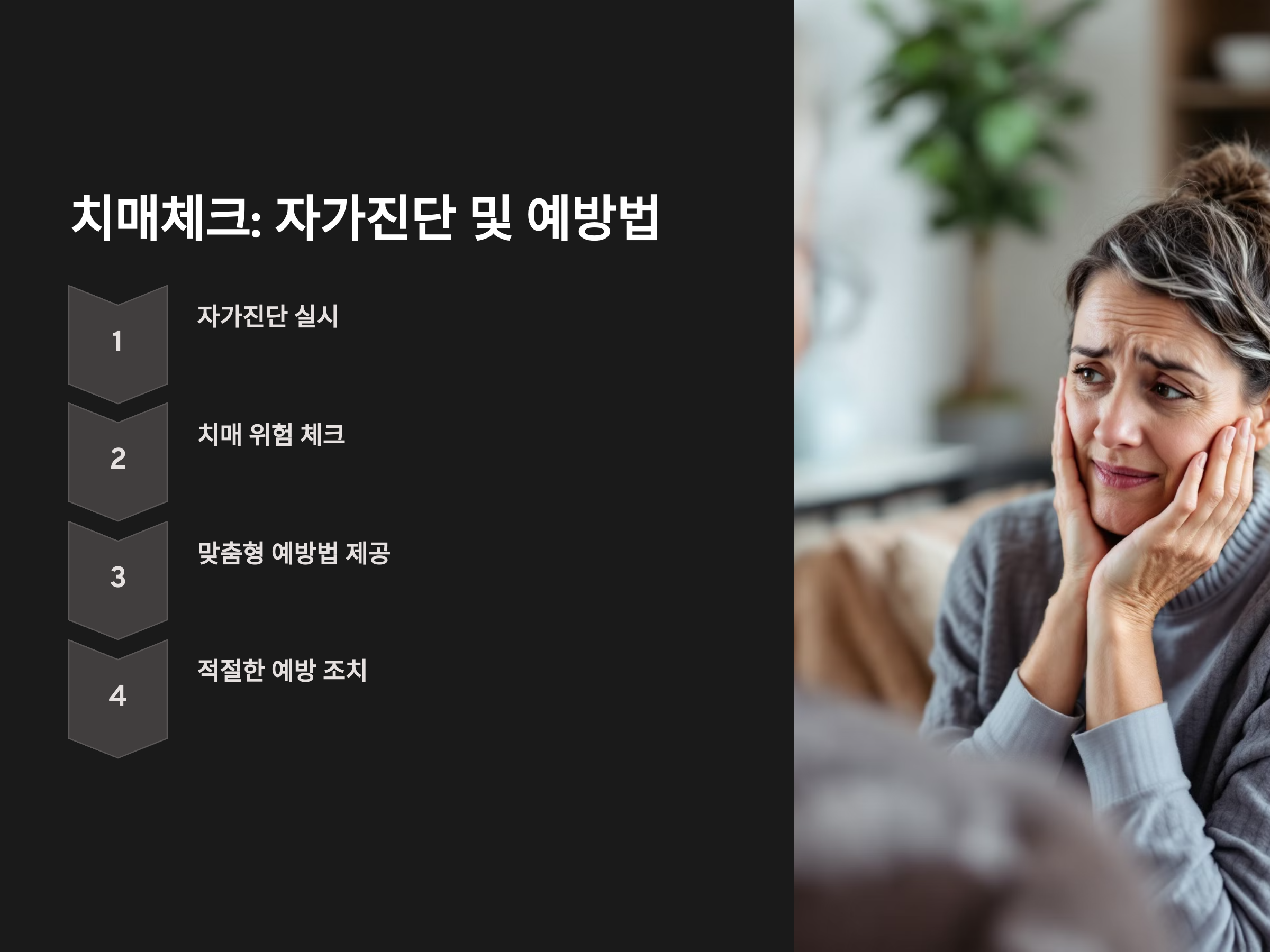 치매체크 앱은 자가진단을 통해 치매 위험을 체크하고, 맞춤형 예방법을 제공합니다. 이를 통해 사용자는 자신의 인지 기능 상태를 파악하고 적절한 예방 조치를 취할 수 있습니다. citeturn0search3
