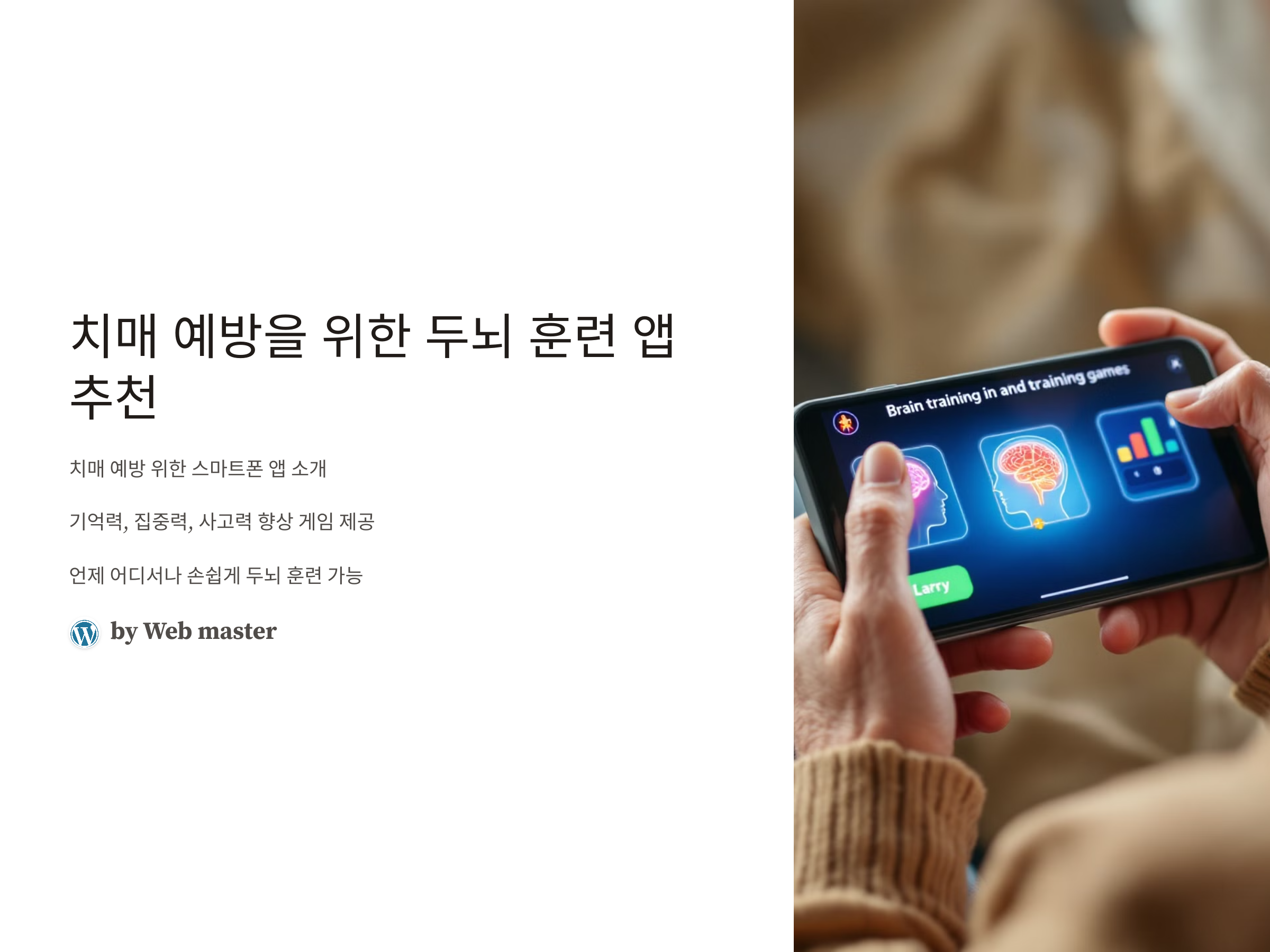 치매는 나이가 들수록 발생할 위험이 커지는 신경퇴행성 질환으로, 이를 예방하기 위한 꾸준한 두뇌 훈련이 중요합니다. 다행히도, 요즘은 스마트폰을 활용해 언제 어디서든 손쉽게 두뇌를 훈련할 수 있는 다양한 앱들이 등장했습니다. 이 앱들은 기억력, 집중력, 사고력을 향상시키는 게임과 훈련을 제공하여, 치매 예방에 도움을 줄 수 있습니다. 오늘은 치매 예방을 위한 효과적인 두뇌 훈련 앱들을 소개하고, 각 앱의 특징과 장점에 대해 살펴보겠습니다.