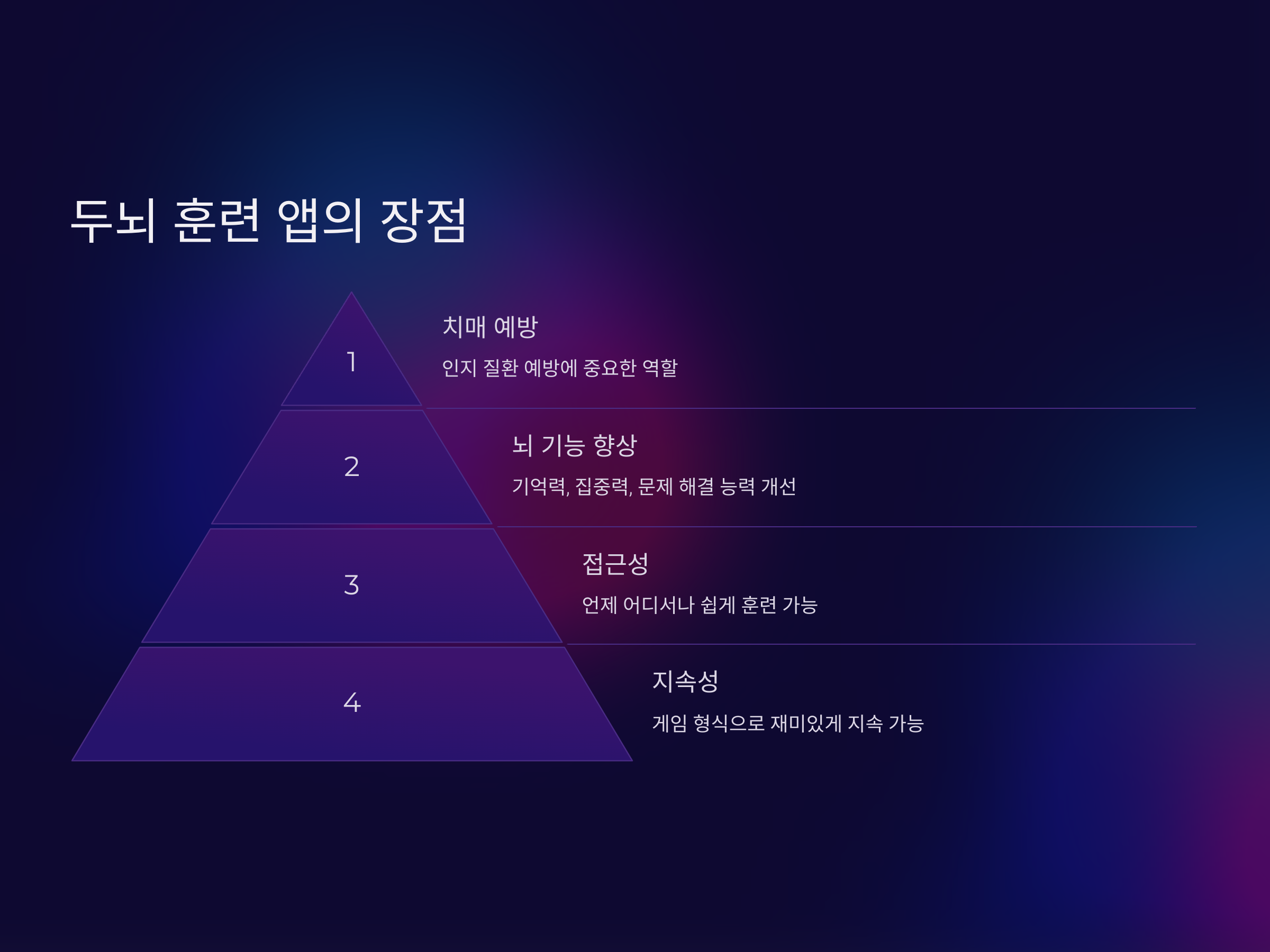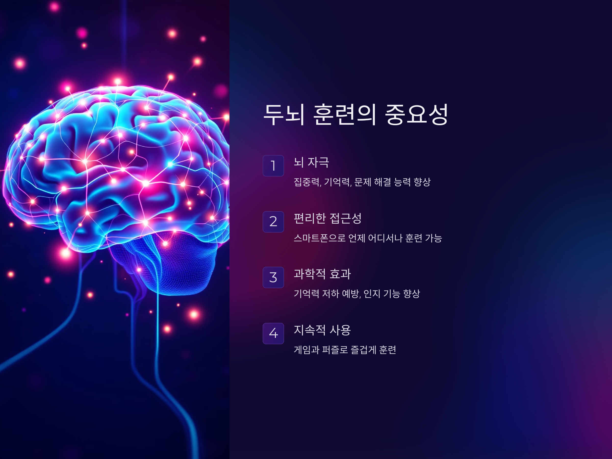많은 연구들에 따르면, 두뇌 훈련은 기억력 저하를 예방하고, 인지 기능을 향상시키는 데 도움이 된다고 합니다. 앱을 통한 꾸준한 두뇌 훈련은 뇌를 활성화시키고, 치매와 같은 인지 질환 예방에 중요한 역할을 할 수 있습니다. 특히 다양한 게임과 퍼즐을 통해 즐겁게 훈련할 수 있어, 지속적으로 사용할 수 있는 장점이 있습니다.