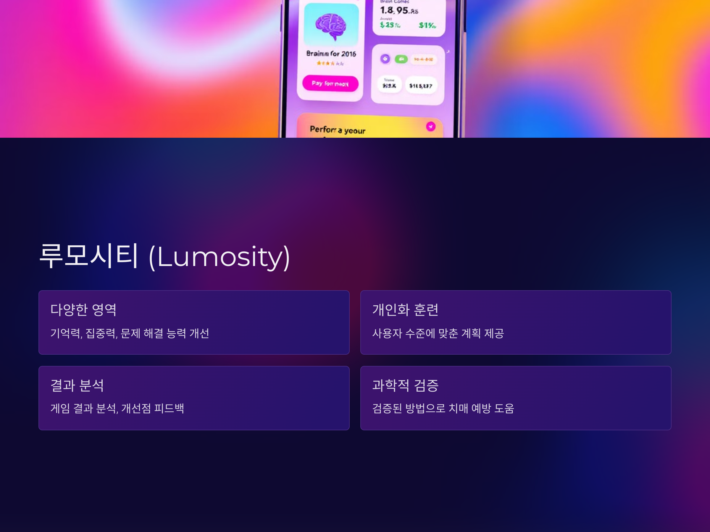 Lumosity는 가장 인기 있는 두뇌 훈련 앱 중 하나로, 기억력, 집중력, 문제 해결 능력 등 다양한 영역을 개선할 수 있는 게임들을 제공합니다. 이 앱은 사용자의 수준에 맞춰 개인화된 훈련 계획을 제공하며, 꾸준한 훈련을 통해 점차적으로 두뇌 기능을 향상시킬 수 있습니다. 또한, 게임 결과를 분석하여 어떤 부분을 개선해야 하는지에 대한 피드백도 제공합니다. 이 앱은 과학적으로 검증된 방법을 바탕으로 뇌 훈련을 진행하므로 치매 예방에도 큰 도움이 됩니다.