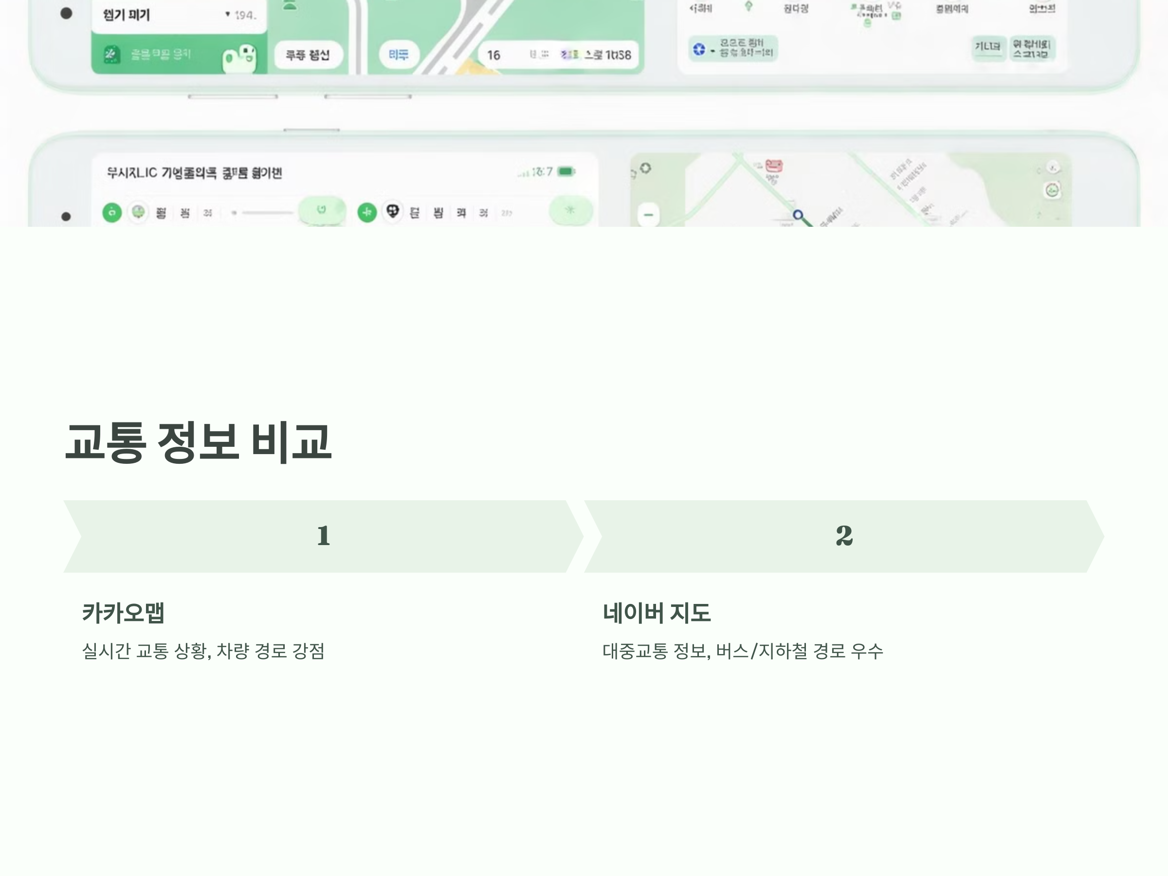 - 네이버 지도는 대중교통 정보와 버스 도착 시간, 지하철 경로 등에서 더 풍부한 정보를 제공합니다.