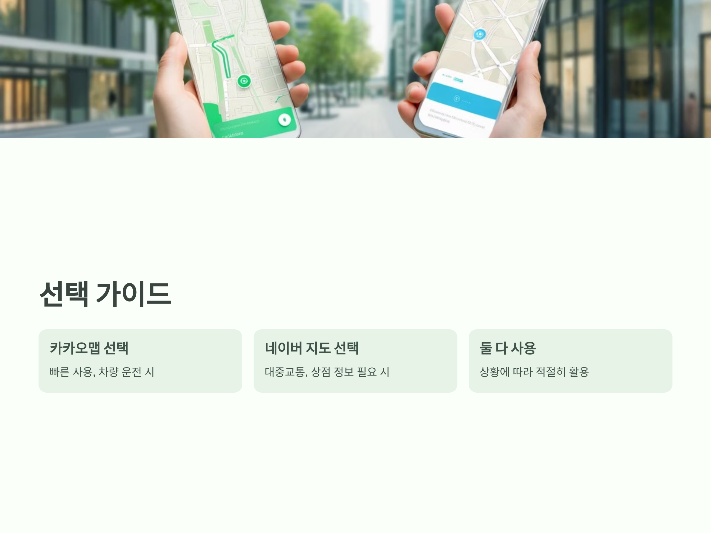 카카오맵과 네이버 지도는 각기 다른 장점이 있습니다. 빠르고 직관적인 사용을 원한다면 카카오맵, 대중교통 정보와 상점 정보를 중요하게 생각한다면 네이버 지도를 추천합니다. 상황에 따라, 차량 운전 시에는 카카오맵, 대중교통을 이용할 때는 네이버 지도가 더 적합할 수 있습니다.