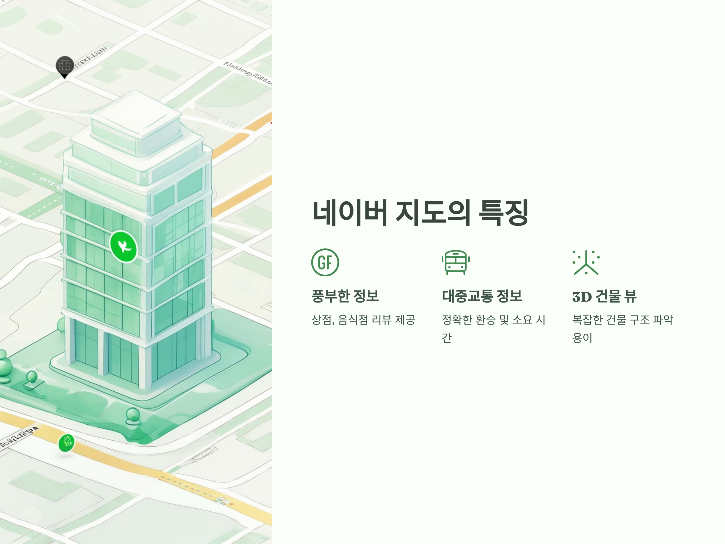 네이버 지도는 대중교통 정보와 상점 정보가 매우 풍부하며, 3D 건물 뷰와 실내 지도 기능을 제공하여, 복잡한 장소를 쉽게 찾을 수 있는 장점이 있습니다.