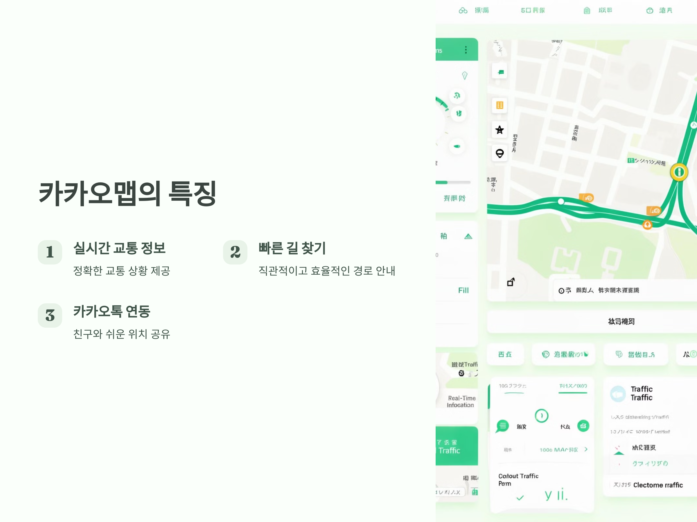 - 카카오맵은 실시간 교통 상황에 강점을 가지고 있으며, 차량 경로 안내에 매우 유용합니다.