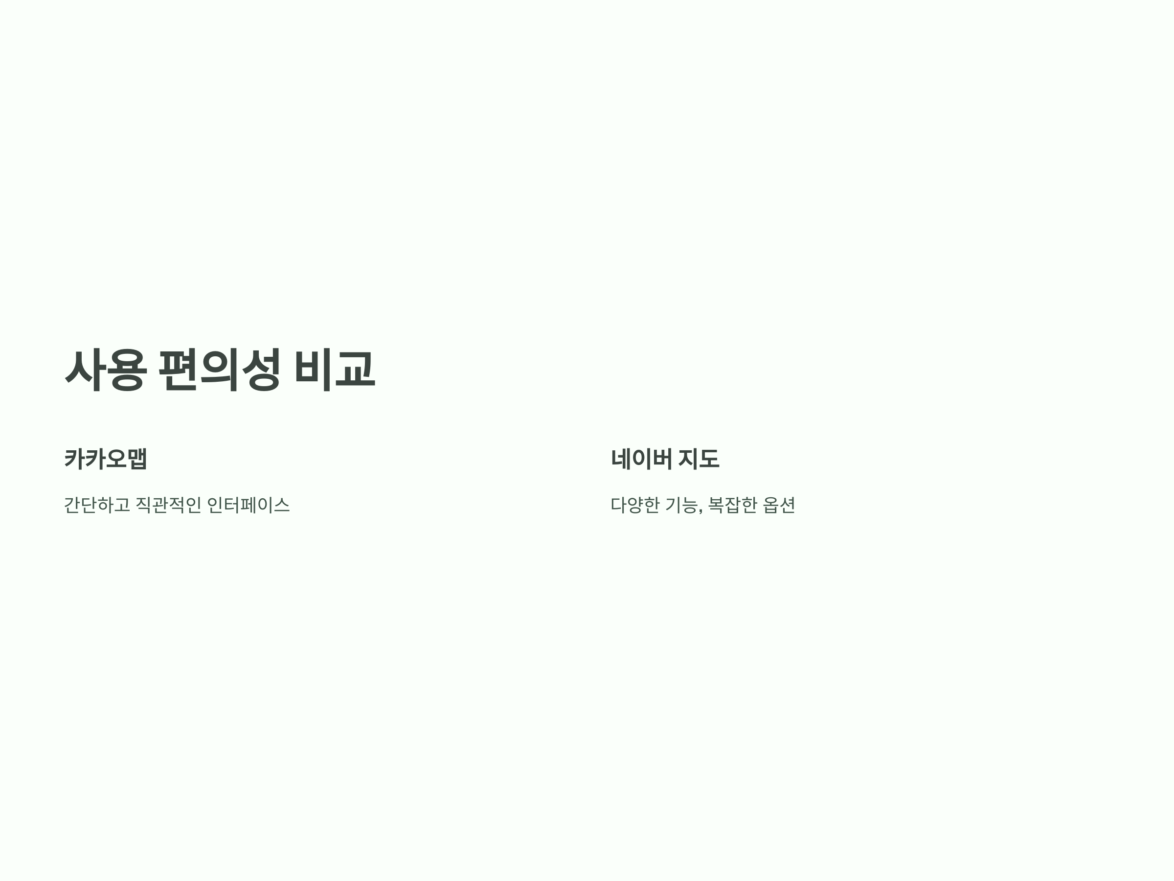 - 네이버 지도는 상점 정보, 리뷰, 맛집 정보 등 광범위한 정보 제공에서 더 나은 성능을 보입니다.