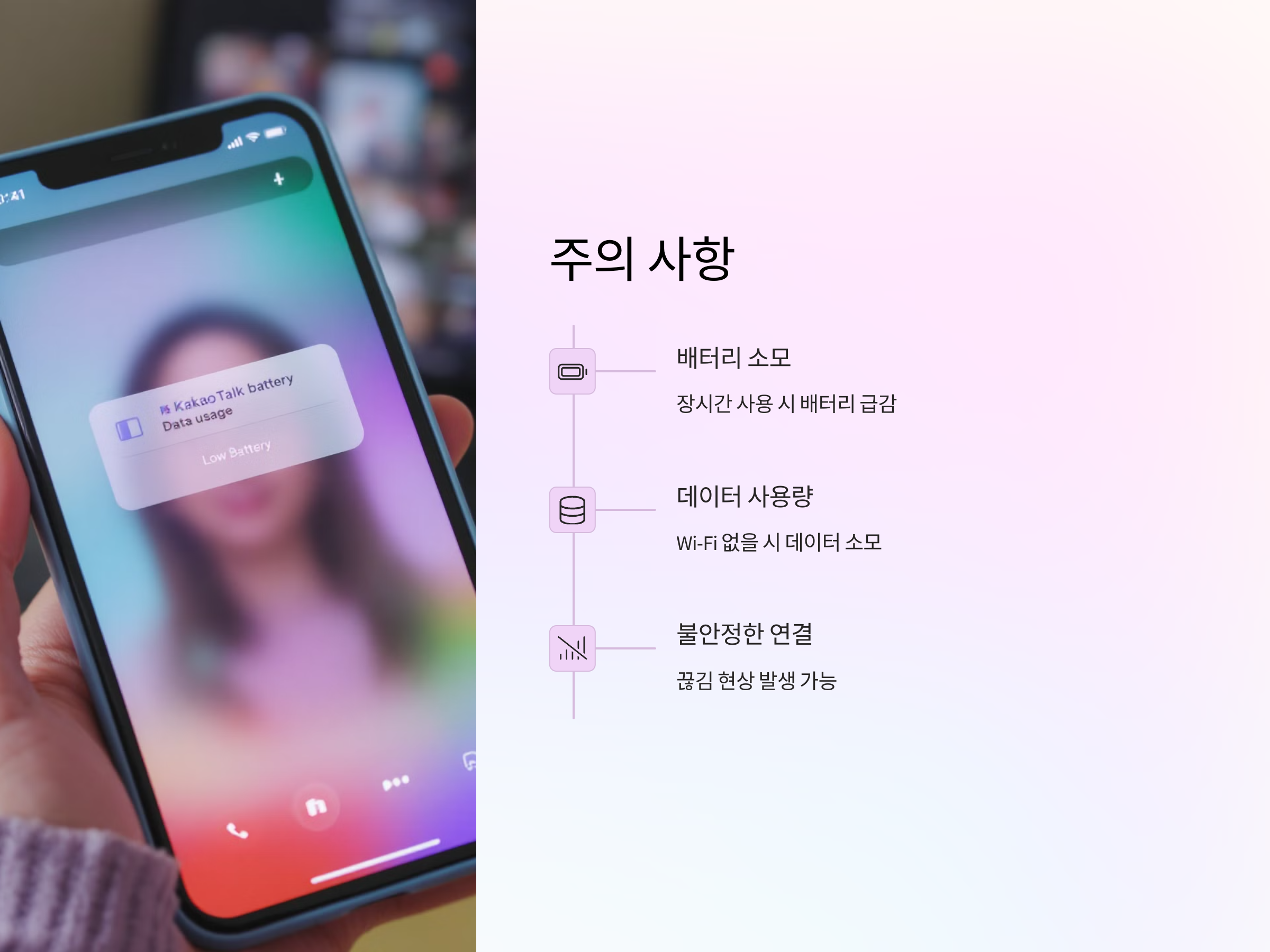 - 모바일 데이터를 사용할 경우, 통화 품질에 영향을 미칠 수 있고, 사용량에 따라 요금이 추가될 수 있습니다.