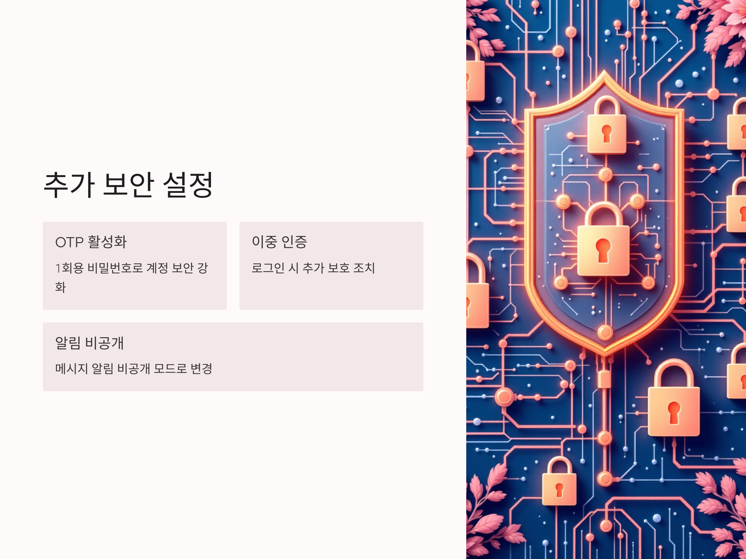 - OTP(1회용 비밀번호) 기능 활성화하여 계정 보안을 강화합니다.