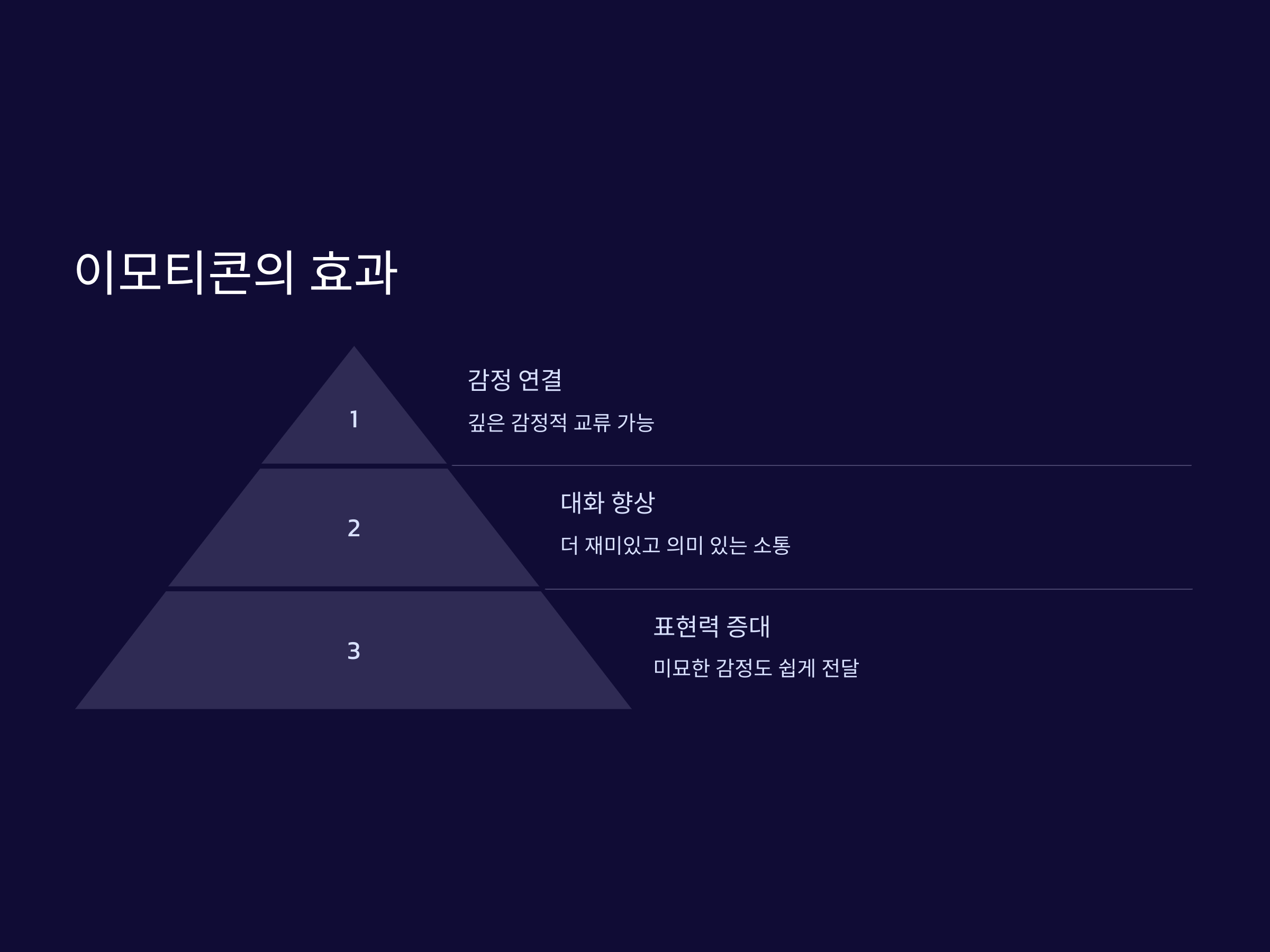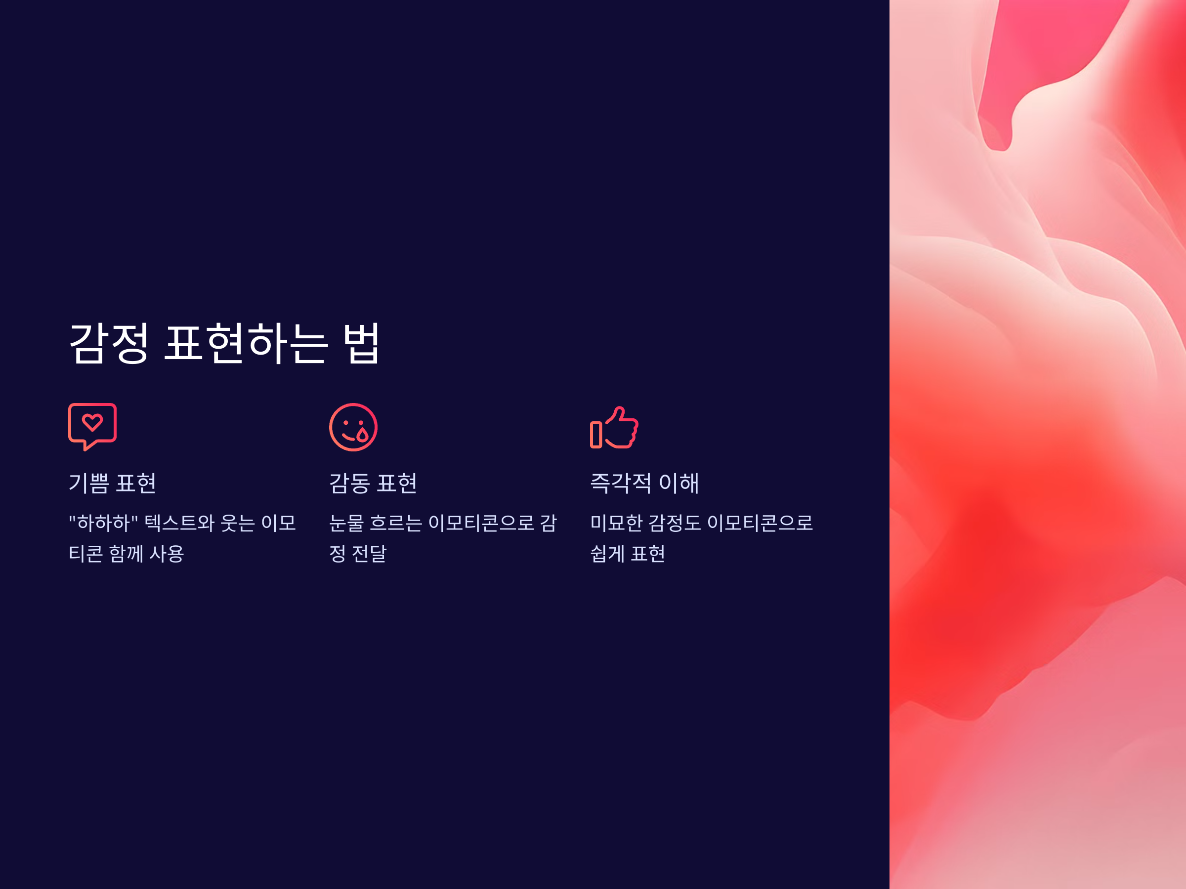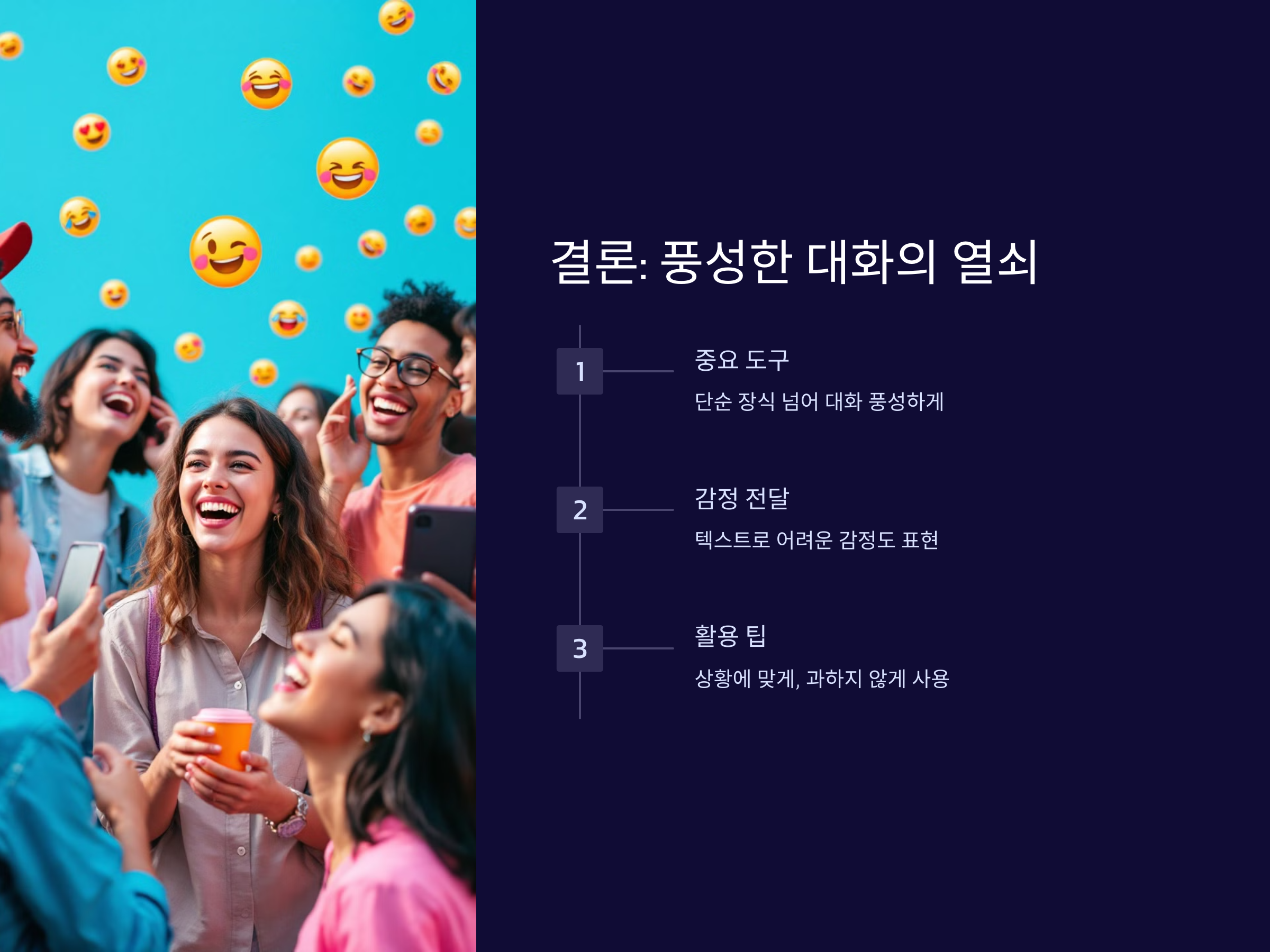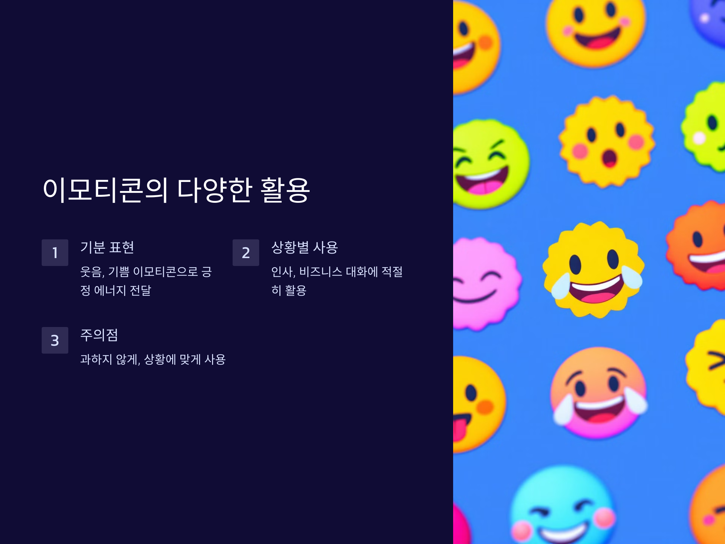 이모티콘이 강력한 이유는 상대방이 그 감정을 즉각적으로 이해할 수 있다는 점입니다. 말로 설명하기 어려운 미묘한 감정을 표현할 때 이모티콘을 활용해 보세요.