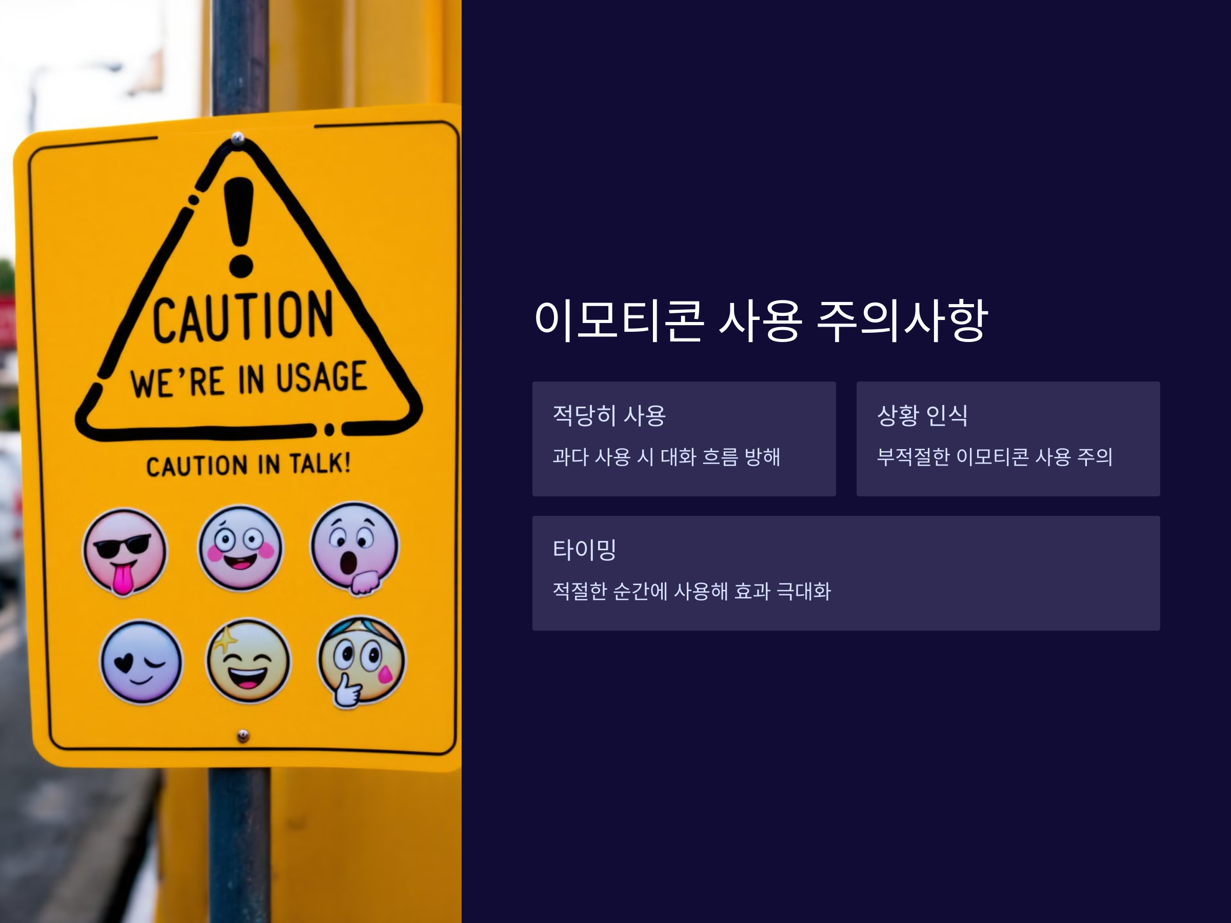 이모티콘을 사용하는 데 있어 몇 가지 주의할 점이 있습니다. 먼저, 너무 많은 이모티콘을 사용하면 대화의 흐름이 끊기고 불필요하게 장황해질 수 있습니다. 적당히 사용하여 대화의 흐름을 자연스럽게 이어가도록 해야 합니다.