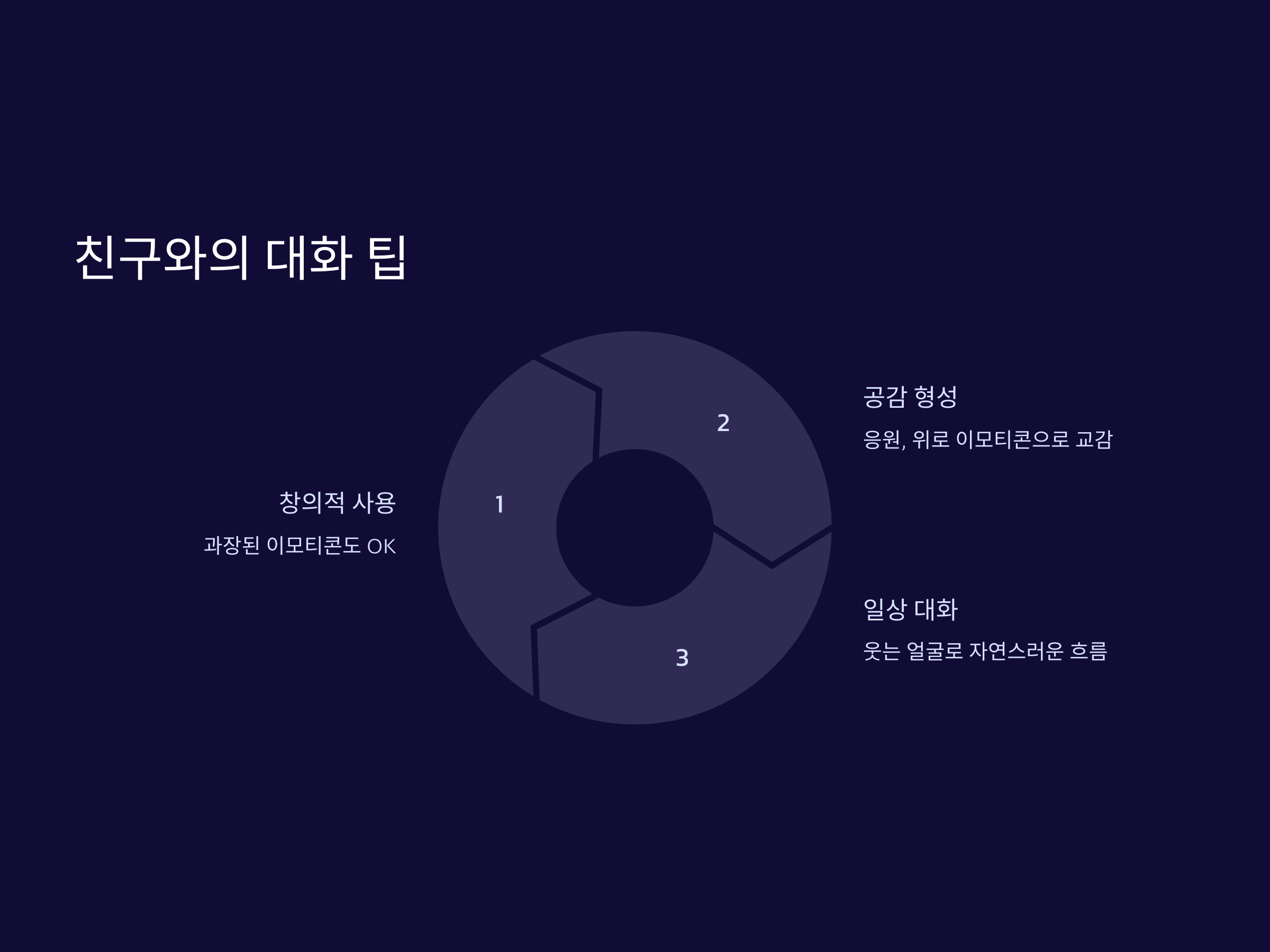 친구와의 대화에서는 이모티콘을 통해 상대방과의 감정적인 교감을 더욱 강화할 수 있습니다. 이모티콘을 잘 활용하면 대화의 재미와 의미가 깊어지죠.