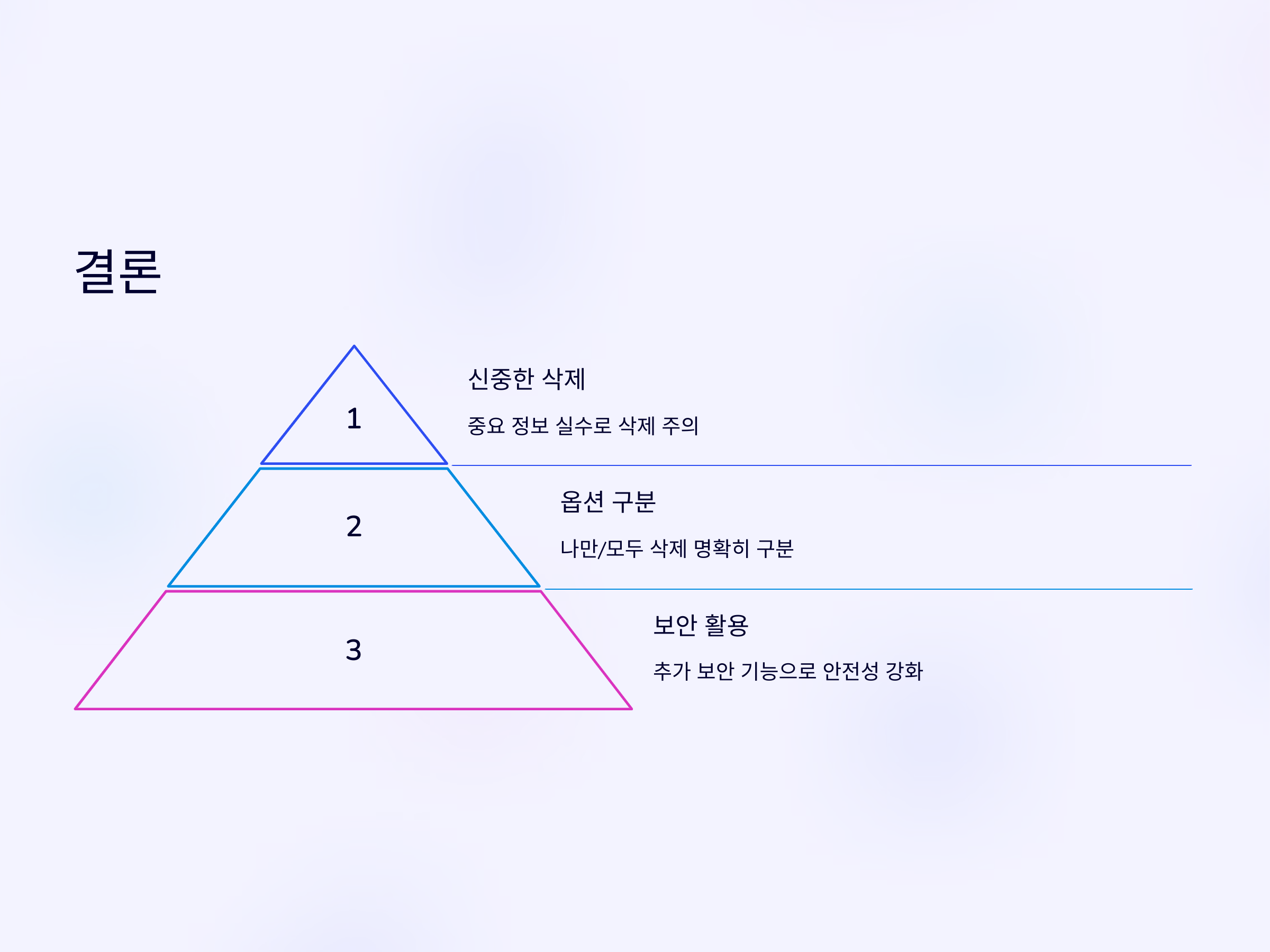 카카오톡에서 대화 삭제하는 방법은 간단하지만, 중요한 정보가 포함된 메시지를 실수로 삭제하지 않도록 신중하게 진행해야 합니다. 대화 삭제 시 "나만 삭제"와 "모두 삭제" 옵션을 잘 구분하여 사용하고, 삭제 후에는 그 내용을 복구할 수 없다는 점을 염두에 두어야 합니다. 또한, 보안 기능을 활용하여 대화의 안전성을 높이는 방법을 활용하는 것이 좋습니다.