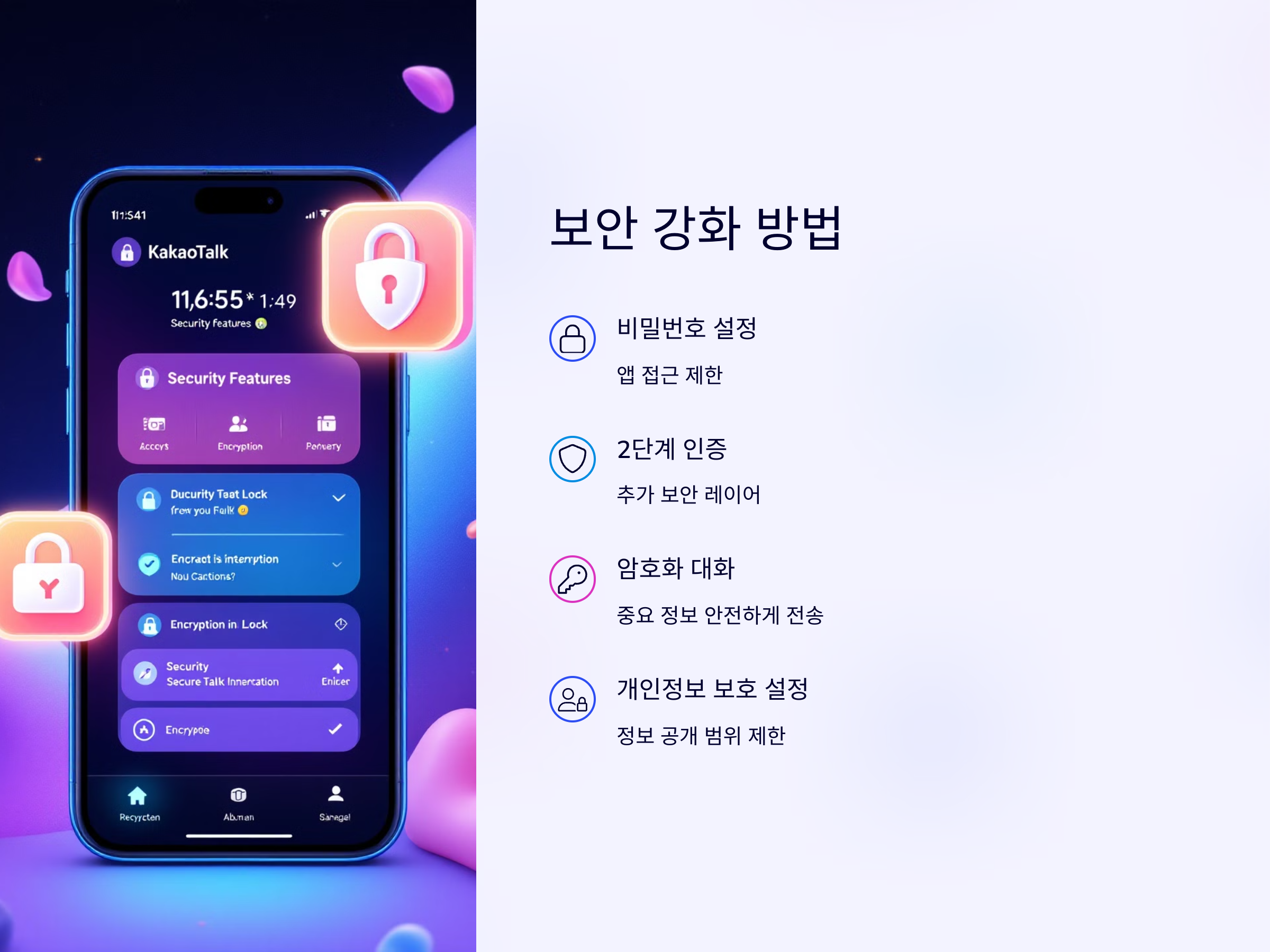 카카오톡에는 다양한 보안 설정이 있어, 대화 내용을 안전하게 보호할 수 있습니다. 예를 들어, 비밀번호 설정, 2단계 인증, 그리고 대화 내용 암호화 등의 기능을 사용하여 불필요한 정보 유출을 방지할 수 있습니다.