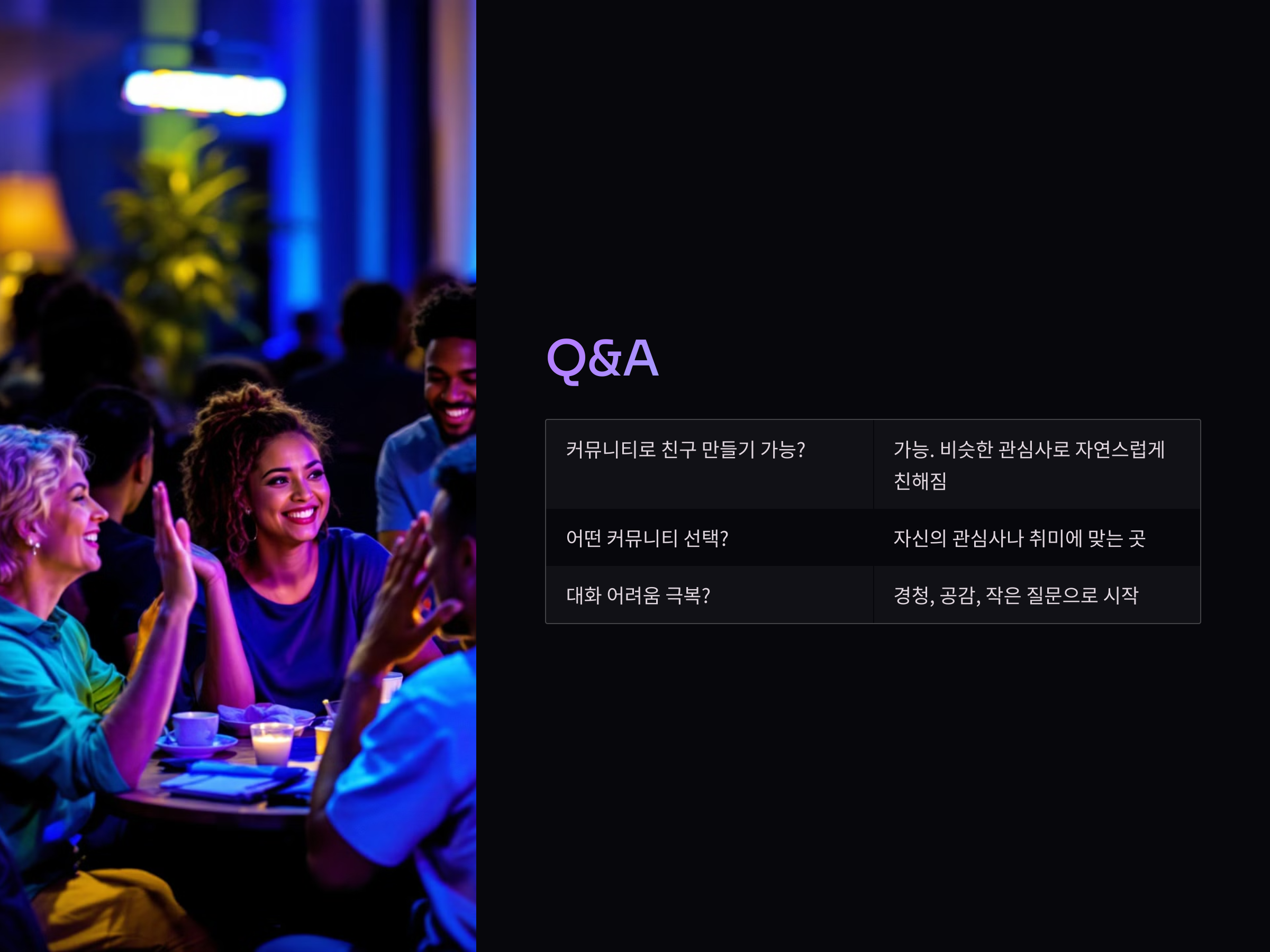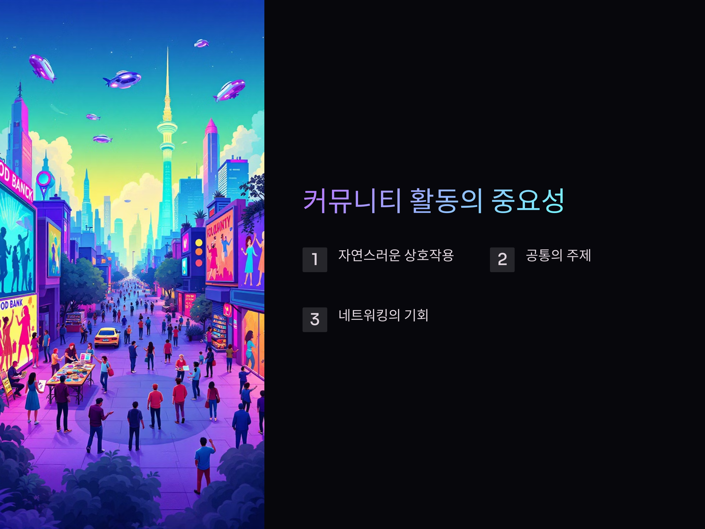 - 네트워킹의 기회: 커뮤니티는 친구를 만드는 것 외에도 업무적 네트워킹, 다양한 정보 공유의 장이 될 수 있습니다.