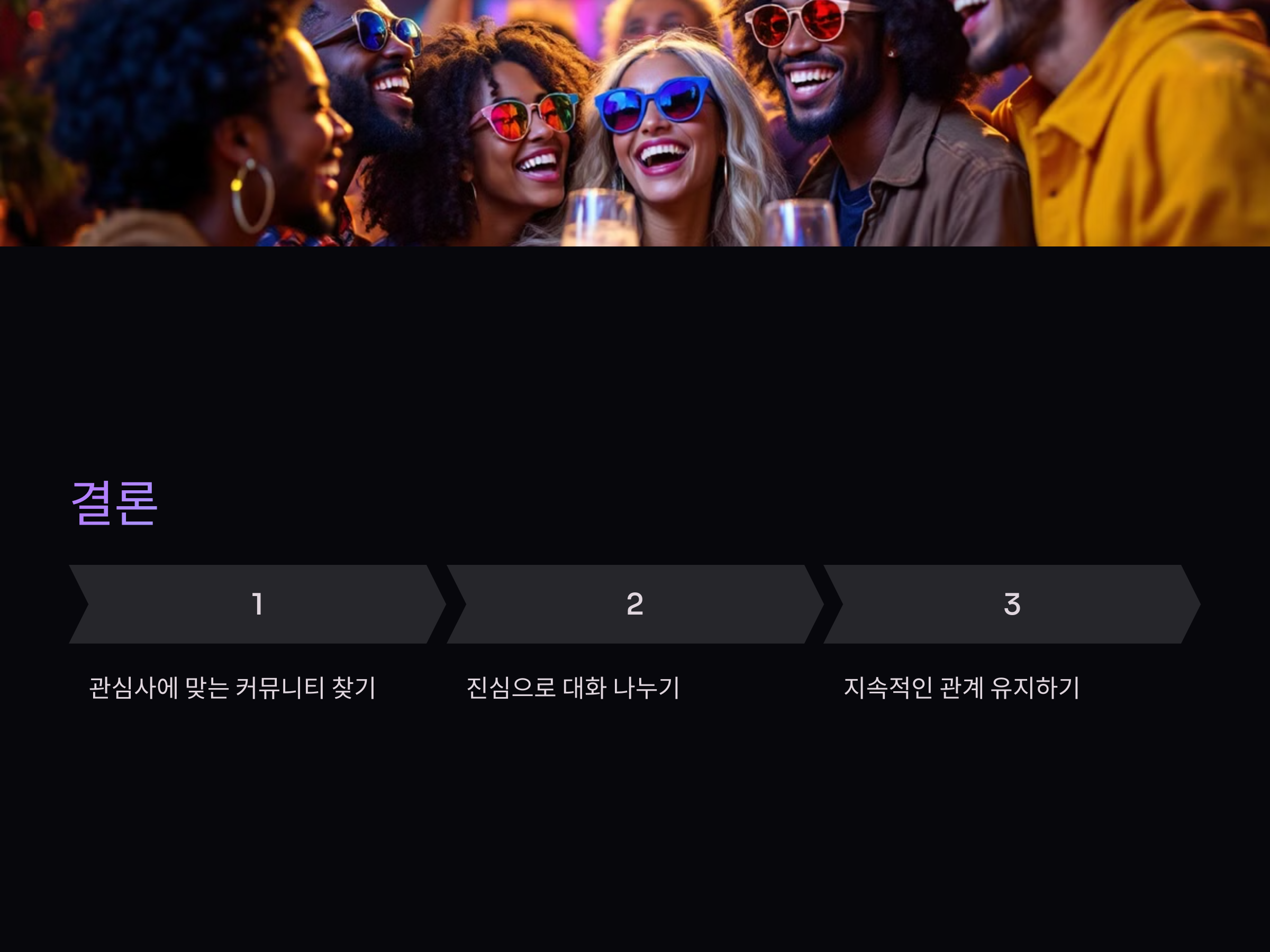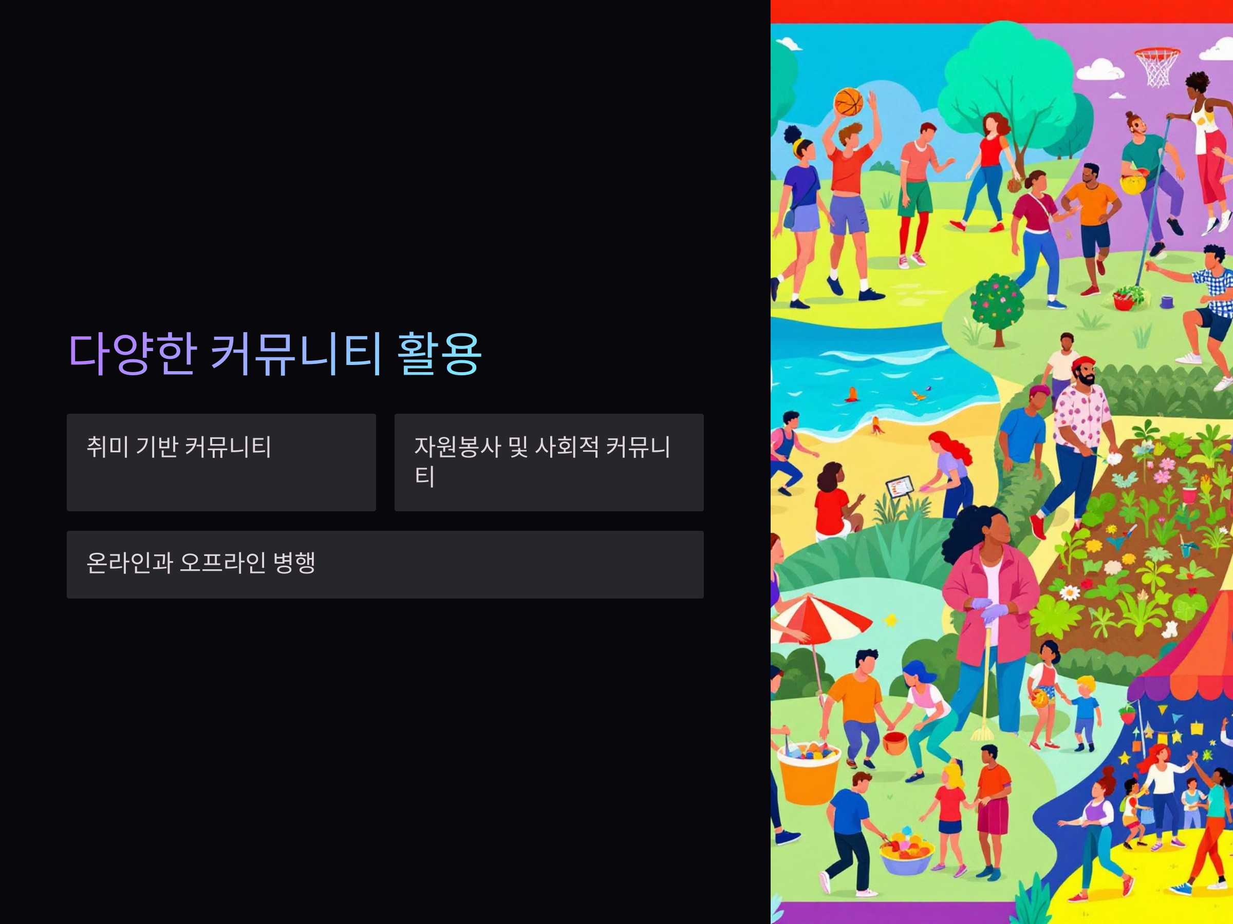 - 나만의 특색을 찾자: 내가 참여할 커뮤니티가 너무 많다면, 하나의 커뮤니티에서 활동을 더욱 집중하고 나만의 특색을 찾는 것이 좋습니다. 내 취미나 전문 분야를 공유하면서 점차 더 많은 사람들과 연결될 수 있습니다.