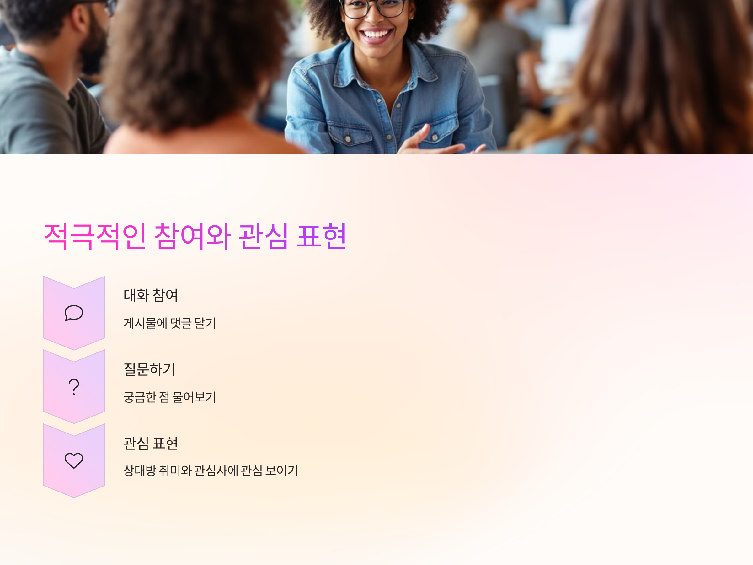 첫 번째 단계는 자신에게 맞는 커뮤니티를 찾는 것입니다. 온라인과 오프라인에서 다양한 커뮤니티가 존재하지만, 모든 커뮤니티가 나에게 적합한 것은 아닙니다. 자신의 관심사나 취미에 맞는 커뮤니티를 찾아보는 것이 중요합니다. 예를 들어, 책을 좋아한다면 독서 모임에 참여하거나, 운동을 좋아한다면 운동 관련 커뮤니티에 가입할 수 있습니다. 이렇게 관심사가 비슷한 사람들과의 만남은 자연스럽게 대화를 이어가기 쉽게 만듭니다.