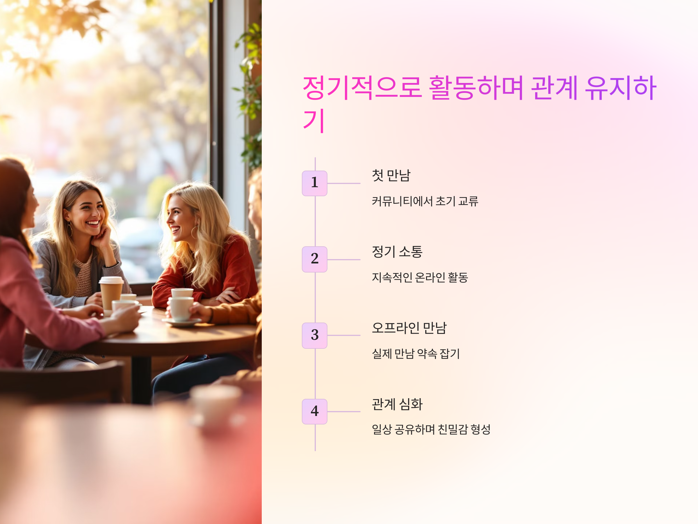 새로운 친구를 만들었다면, 그 관계를 유지하는 것도 중요합니다. 일회성으로 만난 사람들과의 관계는 쉽게 끝날 수 있기 때문에, 정기적으로 그들과 소통하는 것이 중요합니다. 온라인 커뮤니티에서 활동을 지속적으로 하거나, 오프라인에서 만날 기회를 자주 만들어보세요. 이런 꾸준한 관계 유지를 통해 친구가 될 가능성이 높아집니다.
