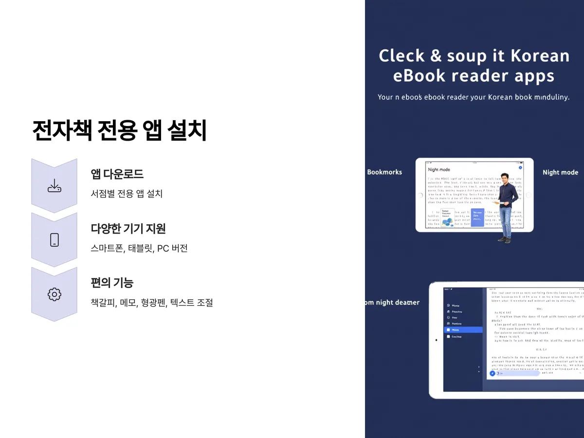 이들 앱은 단순히 책을 읽는 기능 외에도 책갈피, 메모, 형광펜, 텍스트 크기 조절 등 다양한 편의 기능이 있어 학습용으로도 매우 유용합니다. 특히 야간모드나 음성낭독 기능은 시력 보호나 멀티태스킹 환경에서 독서할 때 효과적입니다.