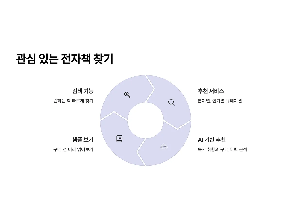 이제 본격적으로 책을 찾아야 합니다. 대부분의 온라인 서점은 검색기능 외에도 '분야별 추천', '인기 전자책', '오늘의 책' 같은 섹션을 통해 사용자의 관심사를 반영한 추천 서비스를 제공합니다. 특히 'AI 기반 큐레이션' 기능은 나의 독서 취향과 과거 구매 이력을 바탕으로 새로운 책을 자동으로 추천해주어 새로운 독서 경험을 만들어줍니다.