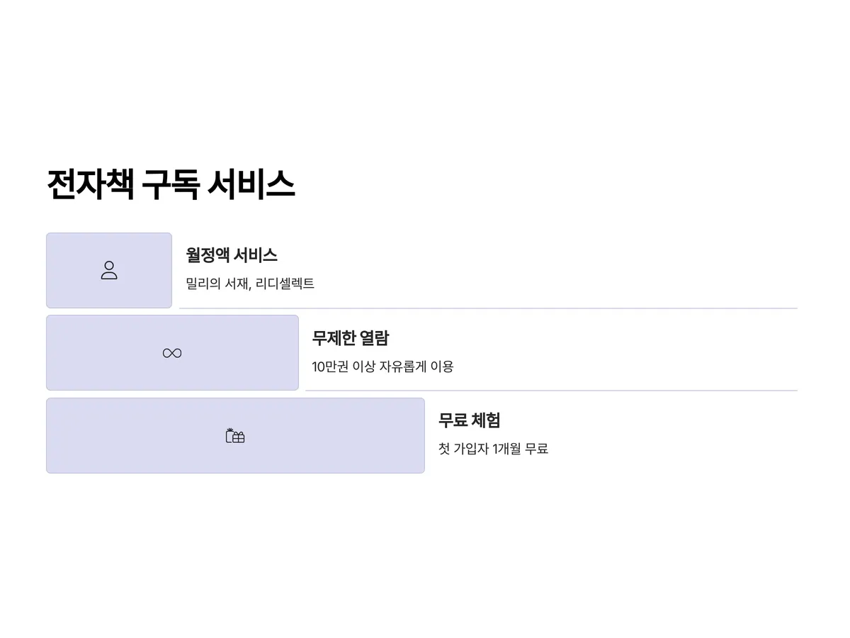 구매 외에도 전자책을 더욱 저렴하게 이용할 수 있는 방법은 '구독 서비스'를 활용하는 것입니다. 밀리의 서재는 월 9,900원으로 10만 권 이상의 책을 무제한 읽을 수 있는 서비스를 제공하며, 리디셀렉트 역시 월정액 방식으로 다양한 콘텐츠를 열람할 수 있습니다.