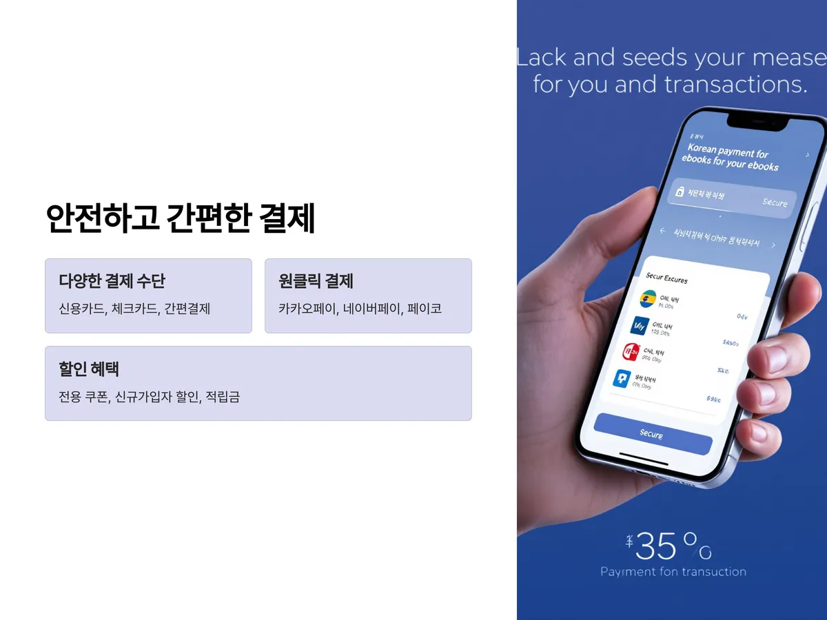 전자책 결제는 매우 간단하며, 다양한 결제 수단이 제공됩니다. 신용카드, 체크카드 외에도 간편결제 시스템(카카오페이, 네이버페이, 페이코 등)이 활발히 도입되어 있어 인증 절차 없이 한 번의 클릭으로 구매할 수 있습니다.