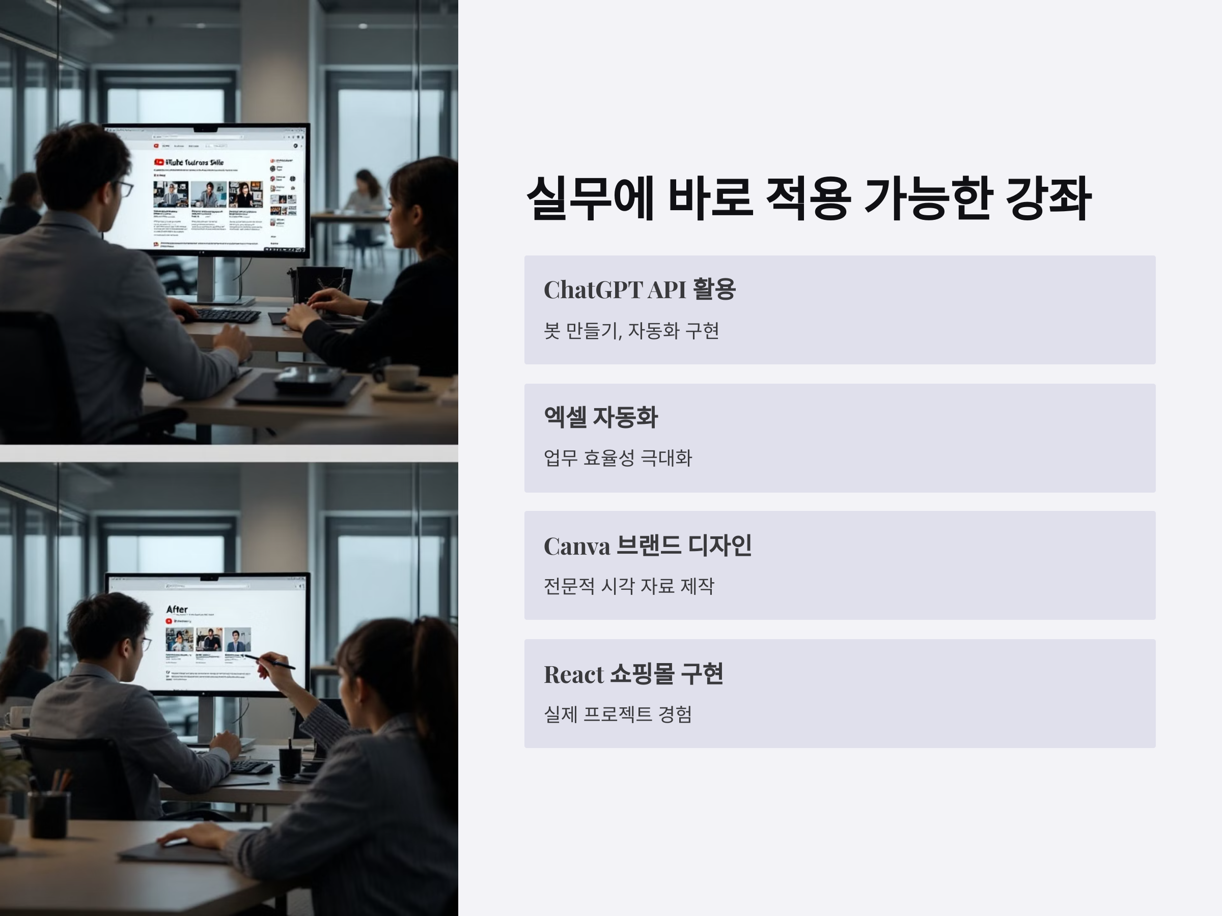 현업에서 바로 써먹을 수 있는 무료 강좌는 효율성이 뛰어납니다. 예를 들어 ChatGPT API를 활용한 봇 만들기, 엑셀 자동화, Canva로 브랜드 디자인 만들기, React로 쇼핑몰 페이지 구현하기 등은 실무 활용도가 높은 콘텐츠입니다. 특히 ‘코딩애플’ 채널의 React, Node.js 강의는 프로젝트 기반으로 구성되어 실무를 그대로 체험할 수 있어 추천됩니다. 또한, 비개발자도 쉽게 접근할 수 있는 Notion 템플릿 제작이나 스마트워크 자동화 강의는 프리랜서에게도 강력 추천할 만한 콘텐츠입니다.