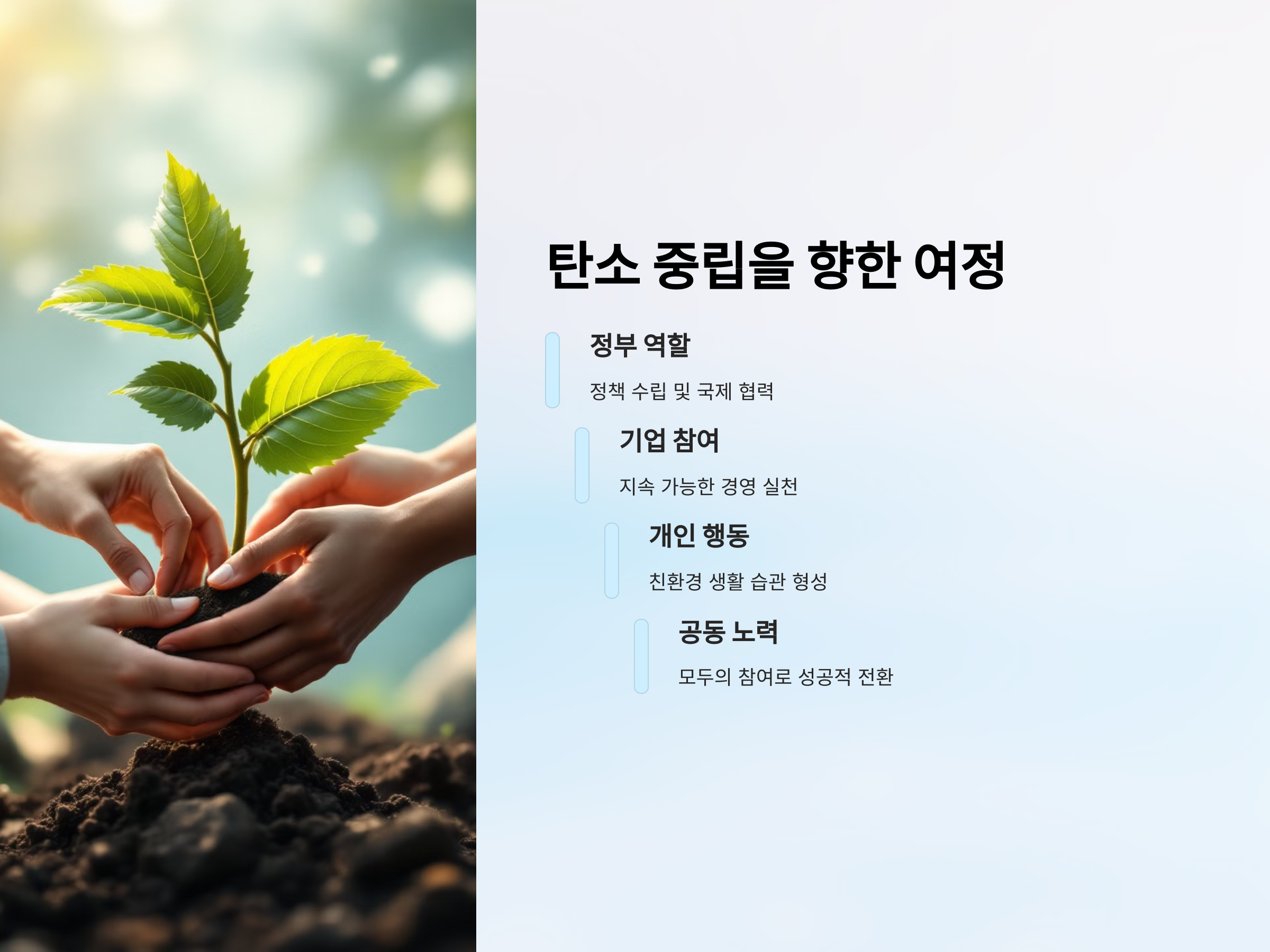 탄소 중립은 단순히 환경 보호를 넘어서, 지속 가능한 사회를 위한 필수적인 조건입니다. 우리가 지금 시작하는 작은 변화들이 모여, 더 나은 미래를 만들어 나갈 수 있을 것입니다.