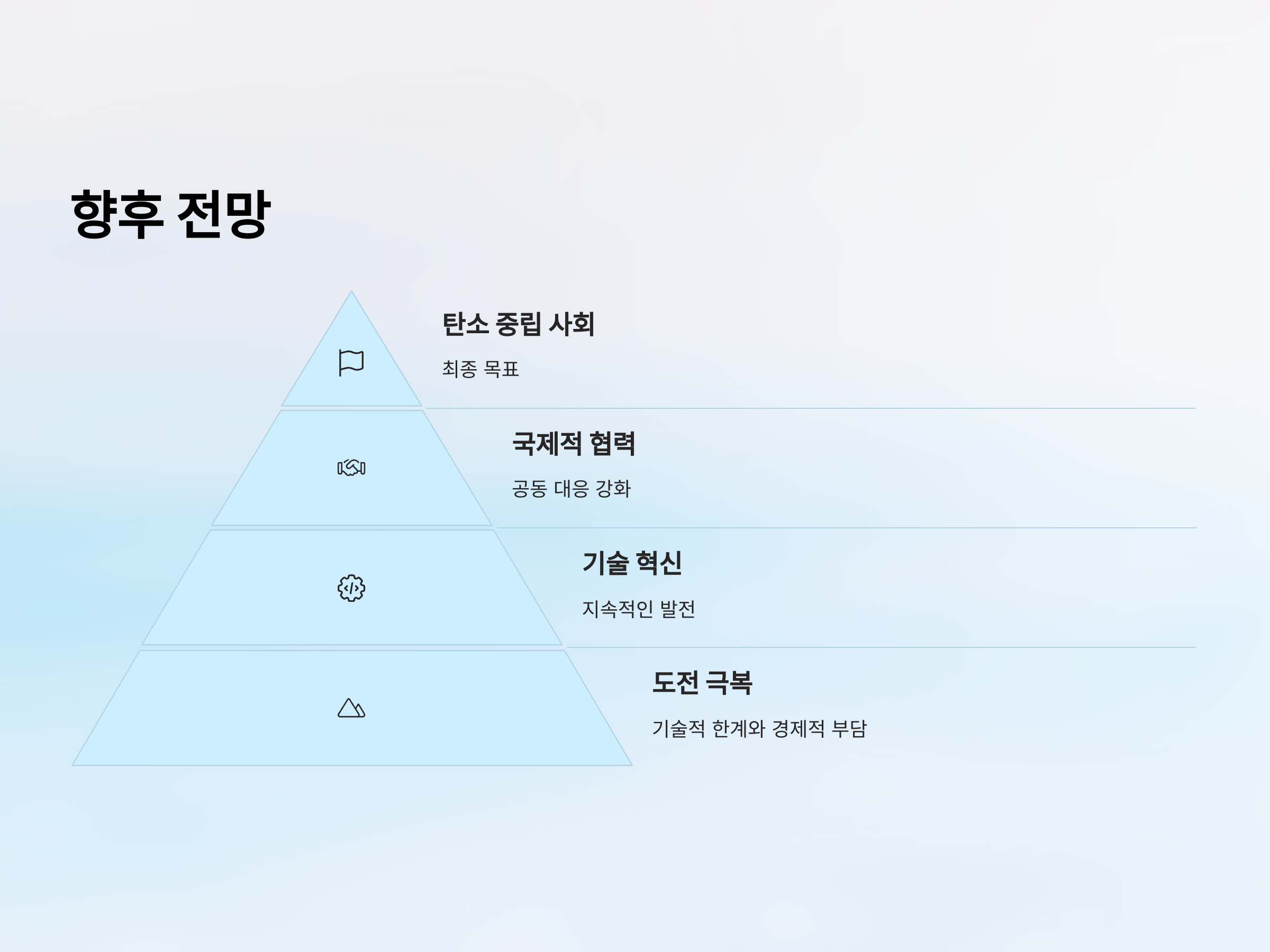 앞으로 더 많은 기술 혁신과 정책 변화가 있을 것이며, 탄소 중립을 향한 여정은 계속해서 발전할 것입니다. 각국 정부는 국제적인 협력을 강화하고, 기업들은 지속 가능한 경영을 통해 온실가스를 줄여 나갈 것입니다. 이러한 노력들이 모여 결국, 탄소 중립 사회를 실현하는 날이 올 것입니다.