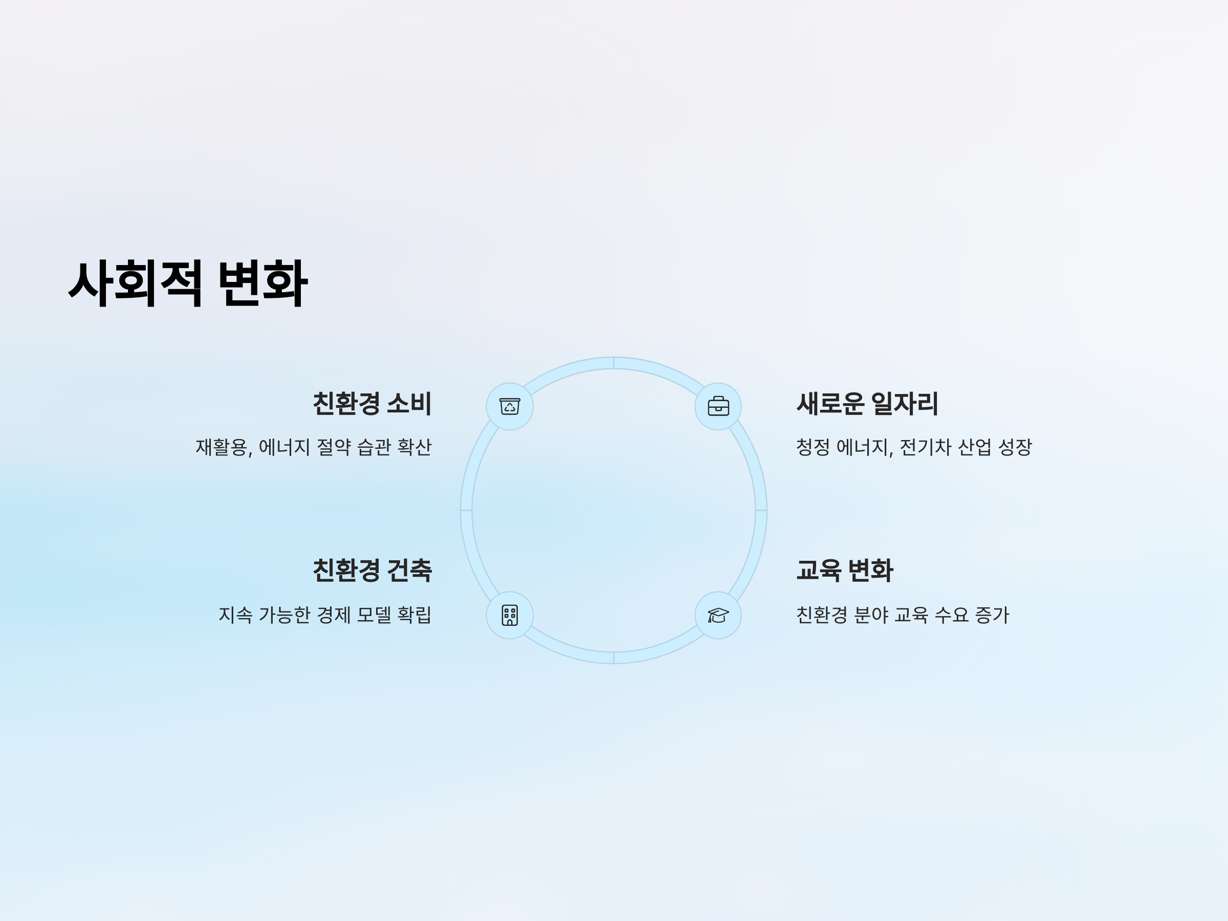 또한, 탄소 중립 목표를 달성하기 위해 새로운 일자리와 산업 분야가 창출되고 있습니다. 청정 에너지 산업, 전기차 산업, 친환경 건축 등 새로운 분야가 성장하면서, 많은 사람들이 새로운 직업을 찾고 이에 대한 교육을 받고 있습니다. 이러한 변화는 사회 전반에 긍정적인 영향을 미치며, 지속 가능한 경제 모델을 확립하는 데 중요한 역할을 하고 있습니다.
