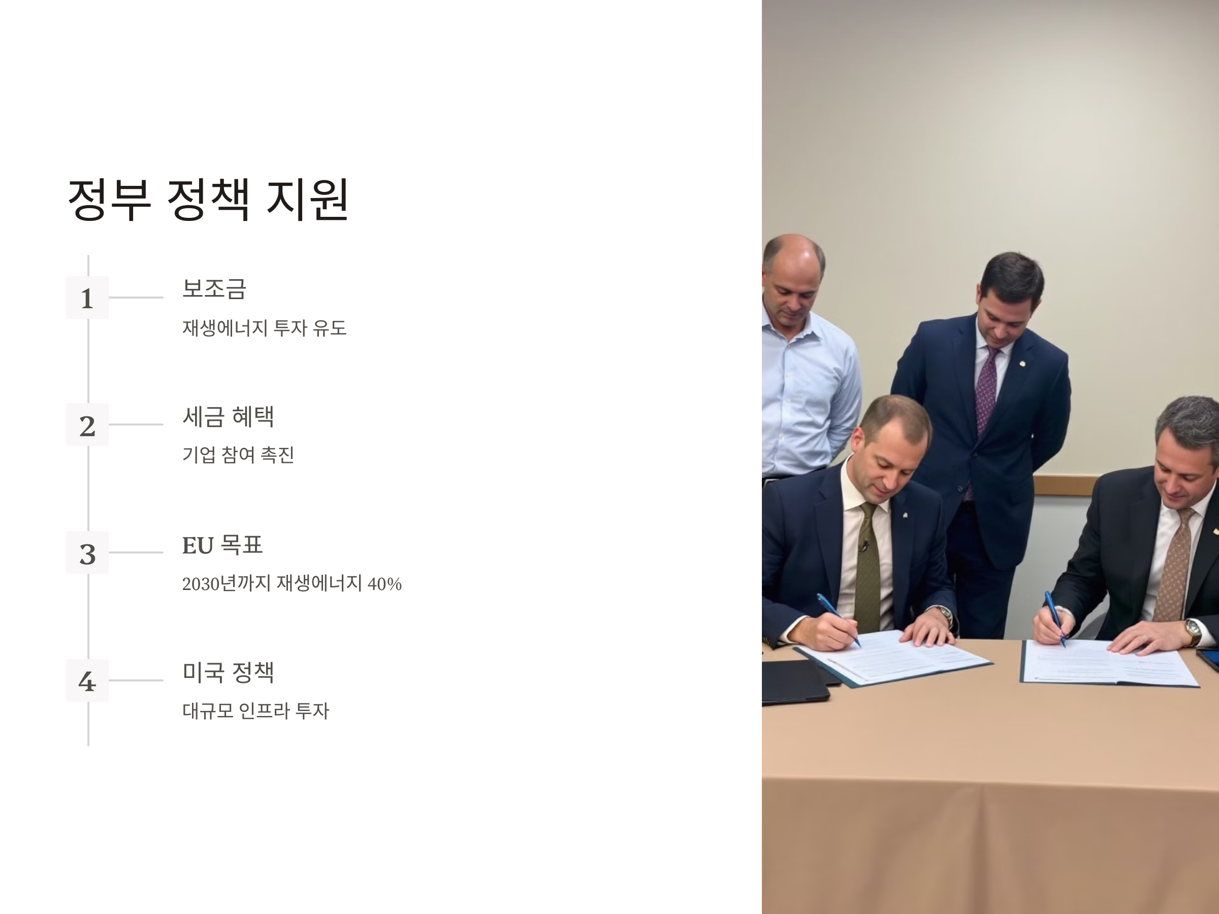 많은 국가들이 태양광 및 풍력 발전의 확대를 위한 정책을 적극적으로 추진하고 있습니다. 특히, 재생 가능 에너지에 대한 보조금, 세금 혜택, 그리고 장기적인 발전 계획은 기업들이 이러한 에너지원에 투자하도록 유도하는 주요한 요인입니다. 이러한 정책적 지원이 재생 가능 에너지 투자 증가의 핵심적인 이유로 꼽히고 있습니다.