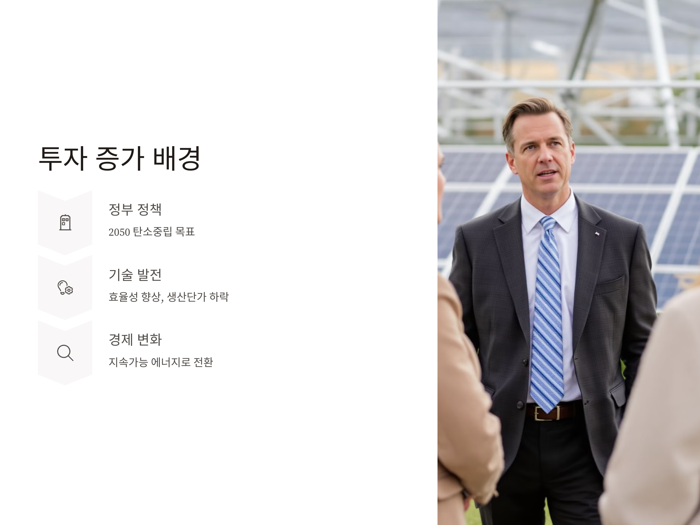 태양광과 풍력 발전에 대한 투자가 증가하는 배경에는 여러 가지 요소가 복합적으로 작용하고 있습니다. 첫째, 정부의 친환경 정책이 주요한 역할을 하고 있습니다. 많은 국가들이 2050년까지 탄소 중립 목표를 설정하고 이에 맞추어 재생 가능 에너지 확산을 촉진하고 있습니다. 또한, 탄소 배출권 거래제나 재생 가능 에너지 보조금과 같은 정책적 지원은 태양광과 풍력 발전의 경제성을 높이고 있습니다.