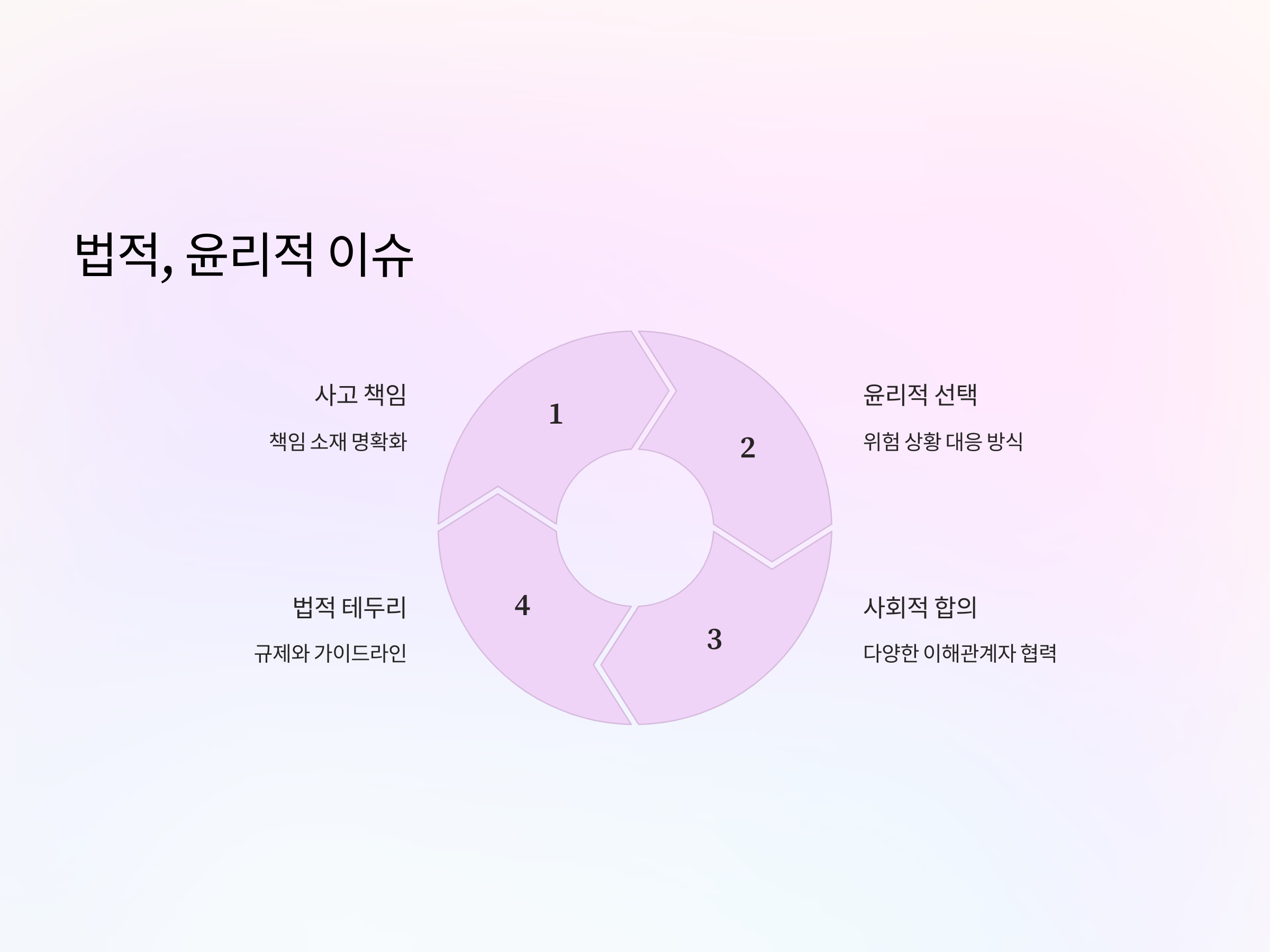 자율주행차의 도입은 법적, 윤리적 문제도 동반할 수 있습니다. 예를 들어, 자율주행차가 사고를 일으켰을 경우 그 책임은 누구에게 있을지, 그리고 사고 발생 시 어떻게 대응할 것인지에 대한 논의가 필요합니다. 테슬라는 이러한 문제를 해결하기 위해 법적 테두리 내에서 자율주행 시스템을 운영할 수 있도록 지속적으로 연구하고 있습니다.