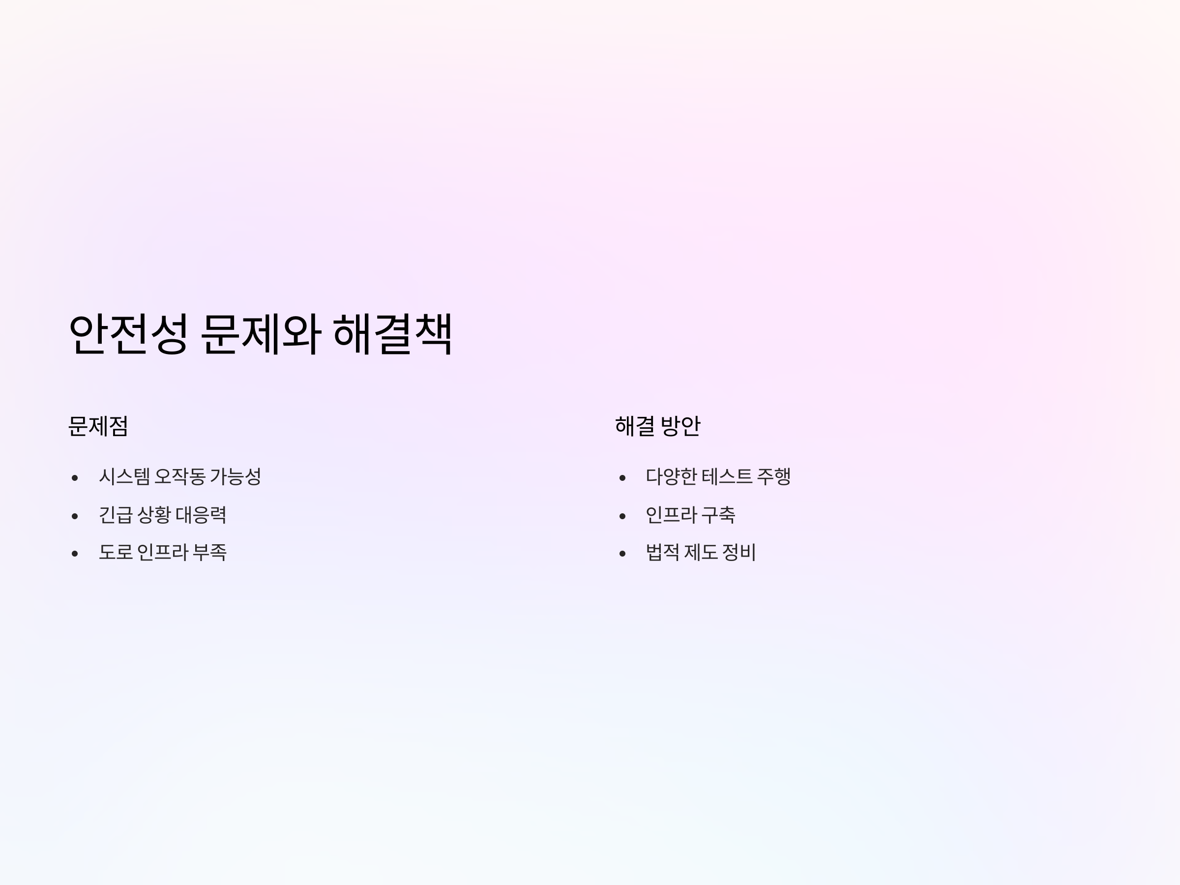 하지만 자율주행차의 안전성에 대한 우려도 여전히 존재합니다. 완전 자율주행이 이루어지기 위해서는 시스템의 오작동을 완전히 없애야 하며, 긴급 상황에서의 대응 능력도 중요한 문제입니다. 테슬라는 이를 해결하기 위해 수많은 테스트 주행을 거쳐 다양한 시나리오에 대한 대응 능력을 강화하고 있습니다.