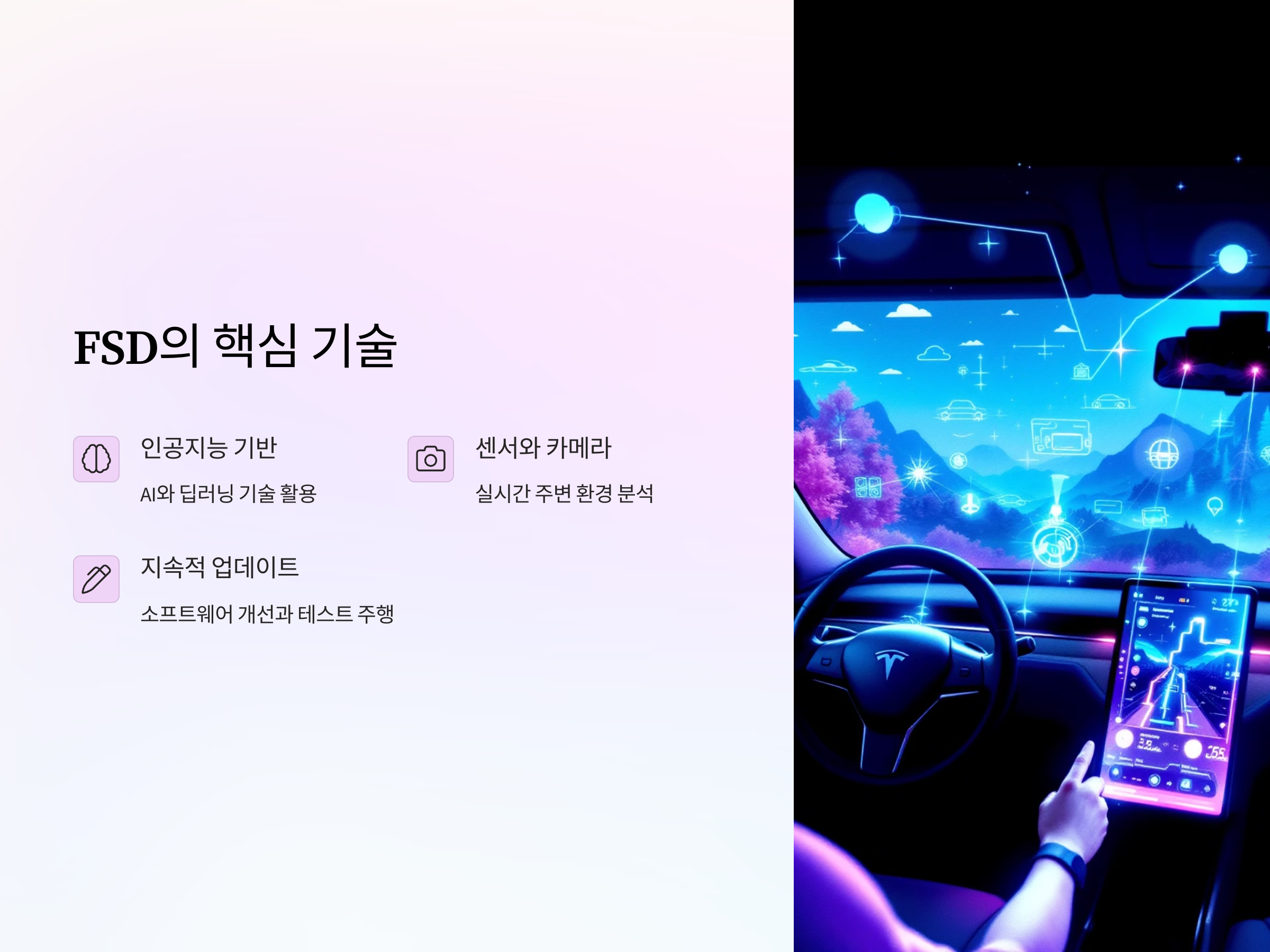 테슬라 FSD의 핵심은 바로 인공지능(AI) 및 딥러닝 기술에 있습니다. 테슬라의 자율주행 시스템은 차량에 장착된 수많은 센서와 카메라를 통해 실시간으로 주변 환경을 분석하고, 이를 바탕으로 스티어링 휠과 가속, 제동을 제어합니다. 이 시스템은 주행 중에 발생할 수 있는 다양한 상황을 인식하고, 운전자의 개입 없이도 안전하게 차를 운전할 수 있게 도와줍니다.