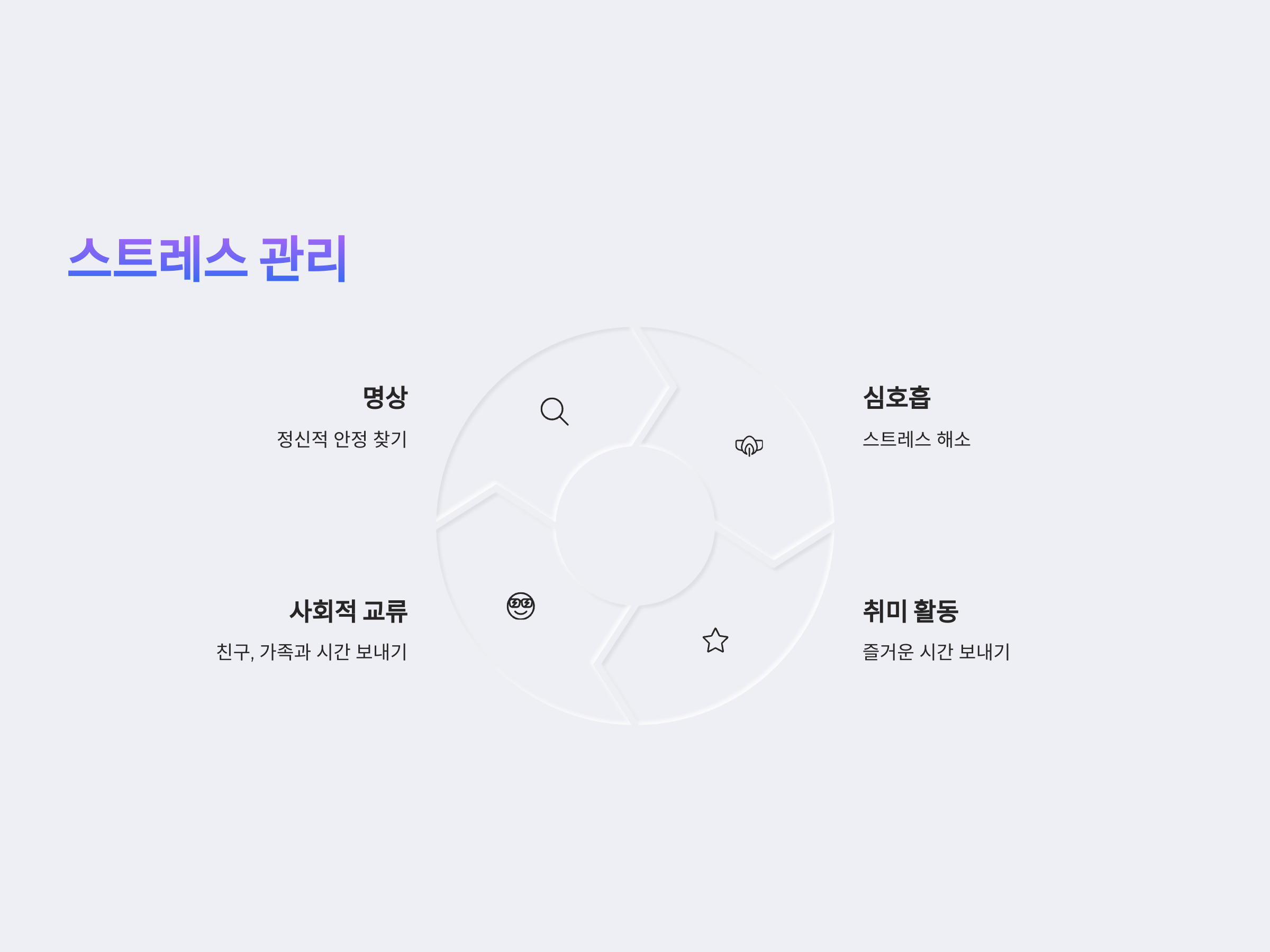 명상, 취미 활동, 가족 및 친구들과의 대화 등을 통해 스트레스를 해소할 수 있습니다. 정기적인 운동도 도움이 됩니다.