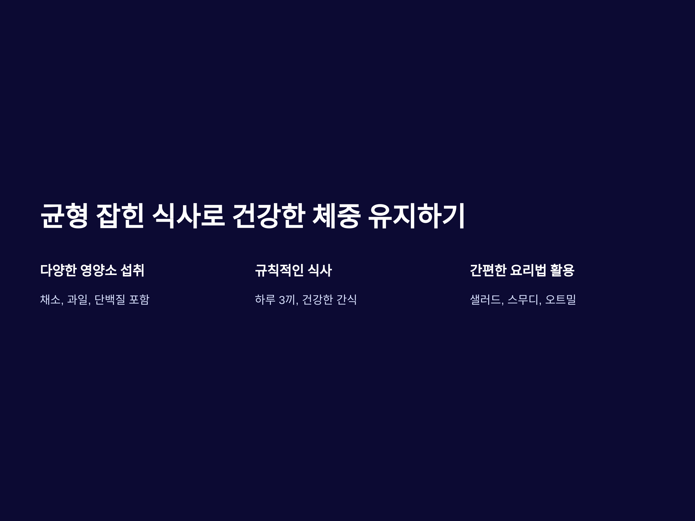 식사는 가능한 한 다양한 채소, 과일, 단백질을 포함한 균형 잡힌 식사를 해야 합니다. 하루 3끼를 규칙적으로 먹고, 간식은 과일이나 견과류로 대체하는 것이 좋습니다. 또한, 퇴직 후에는 활동량이 줄어들기 때문에, 과식을 피하고 적정 칼로리를 섭취하는 것이 체중 관리에 도움을 줍니다.