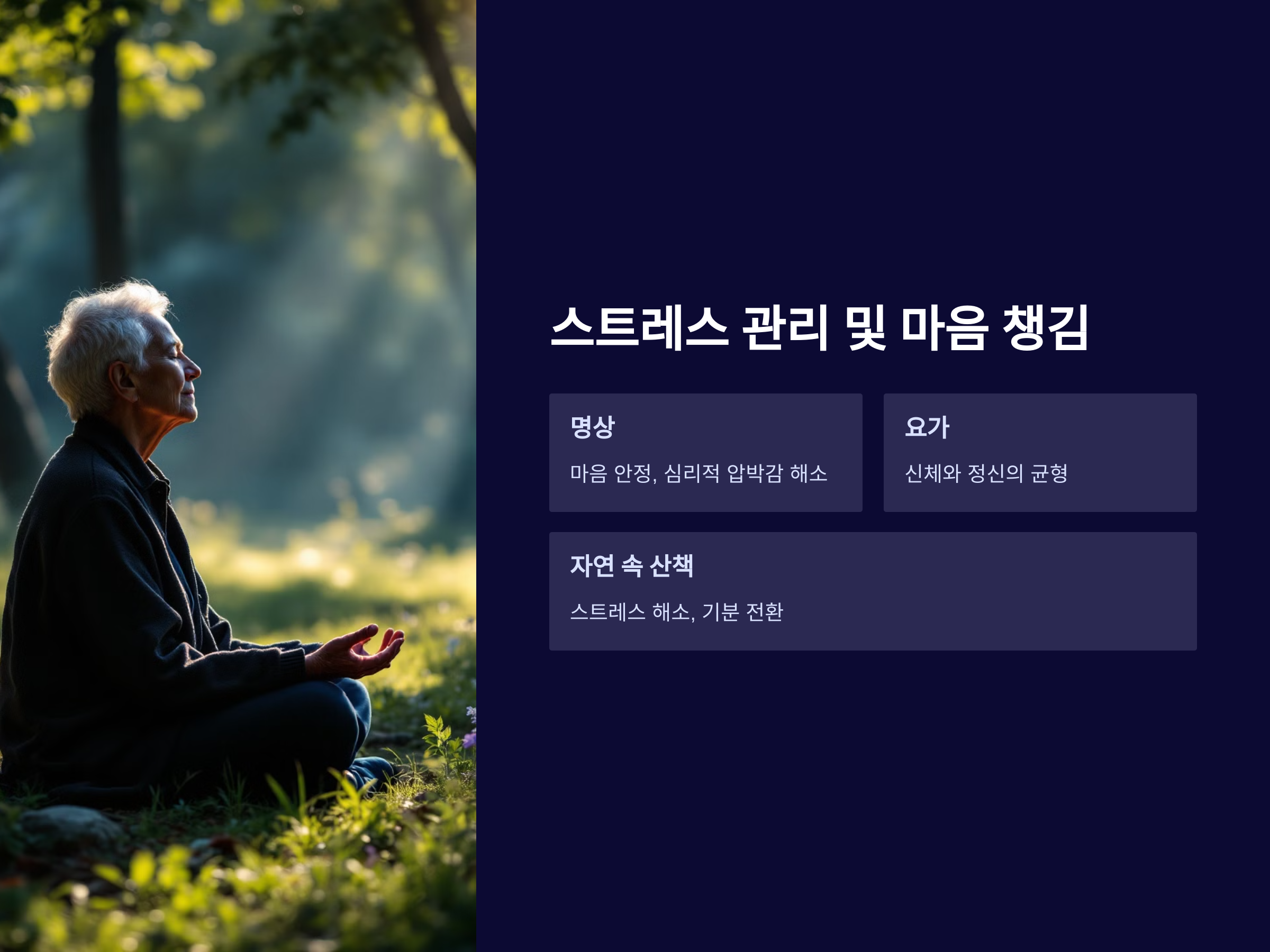 심리적 안정은 건강한 생활을 유지하는 데 있어 가장 중요한 요소 중 하나입니다. 스트레스를 조절하며 마음을 돌보는 것이 퇴직 후에도 건강한 생활을 이어가는 방법입니다.