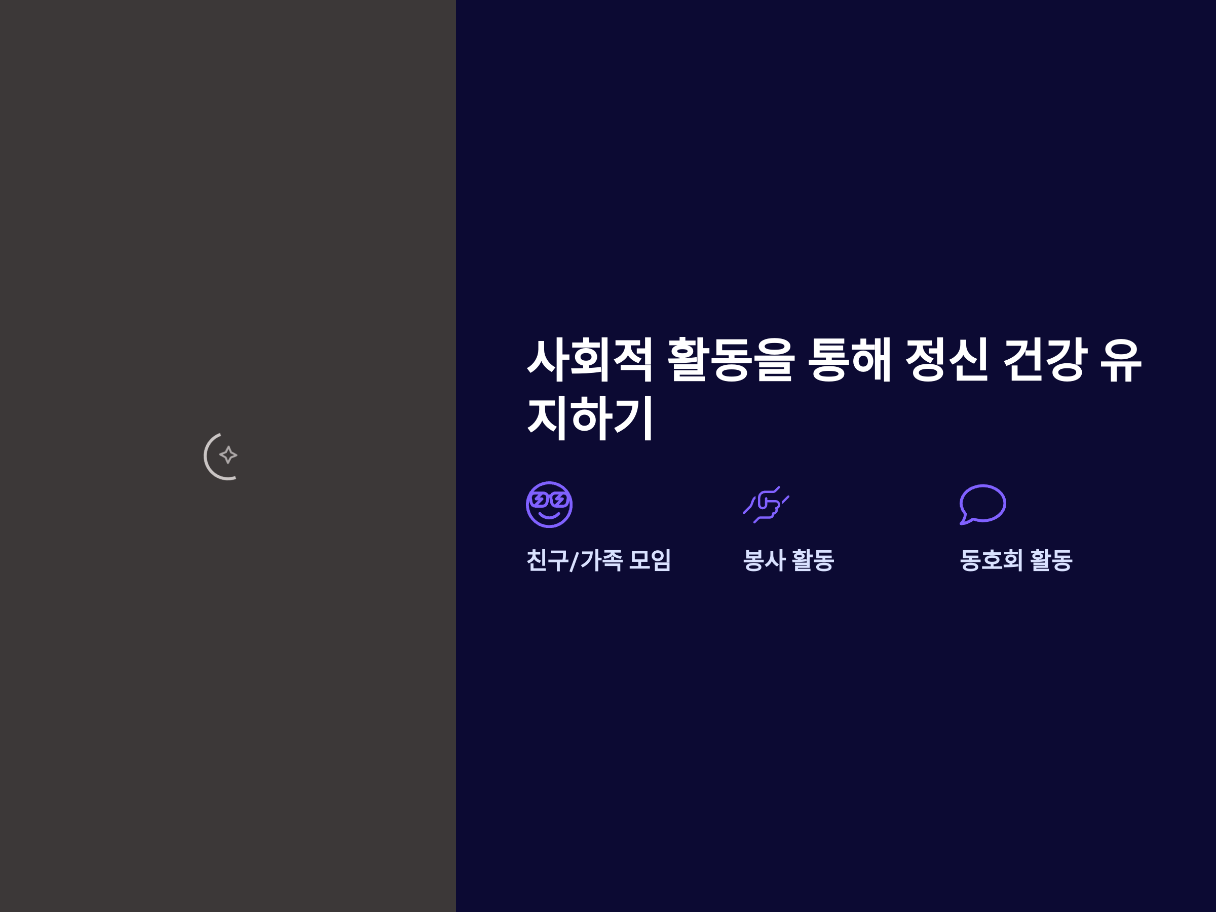 사회적 교류는 외로움을 예방하고, 스트레스를 줄이며, 전반적인 정신 건강을 개선하는 데 큰 도움이 됩니다.