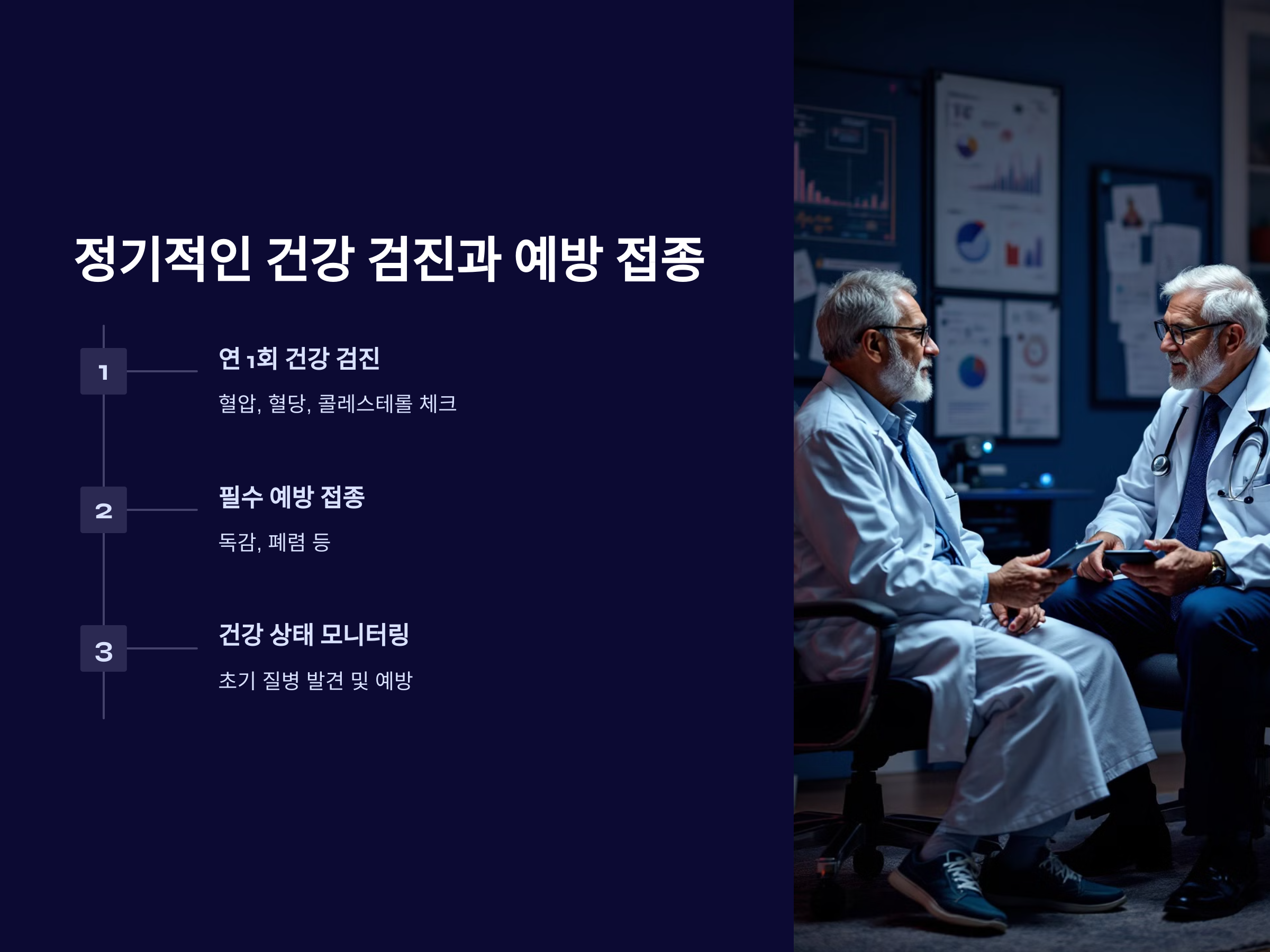 건강 검진은 일반적으로 1년에 한 번 정도 받는 것이 좋습니다. 혈압, 혈당, 콜레스테롤 수치 등을 체크하고, 자신의 몸 상태를 미리 알고 대비하는 것이 중요합니다. 또한, 예방 접종은 특히 독감, 폐렴 등의 질병에 대해 필수적으로 접종하는 것이 좋습니다.