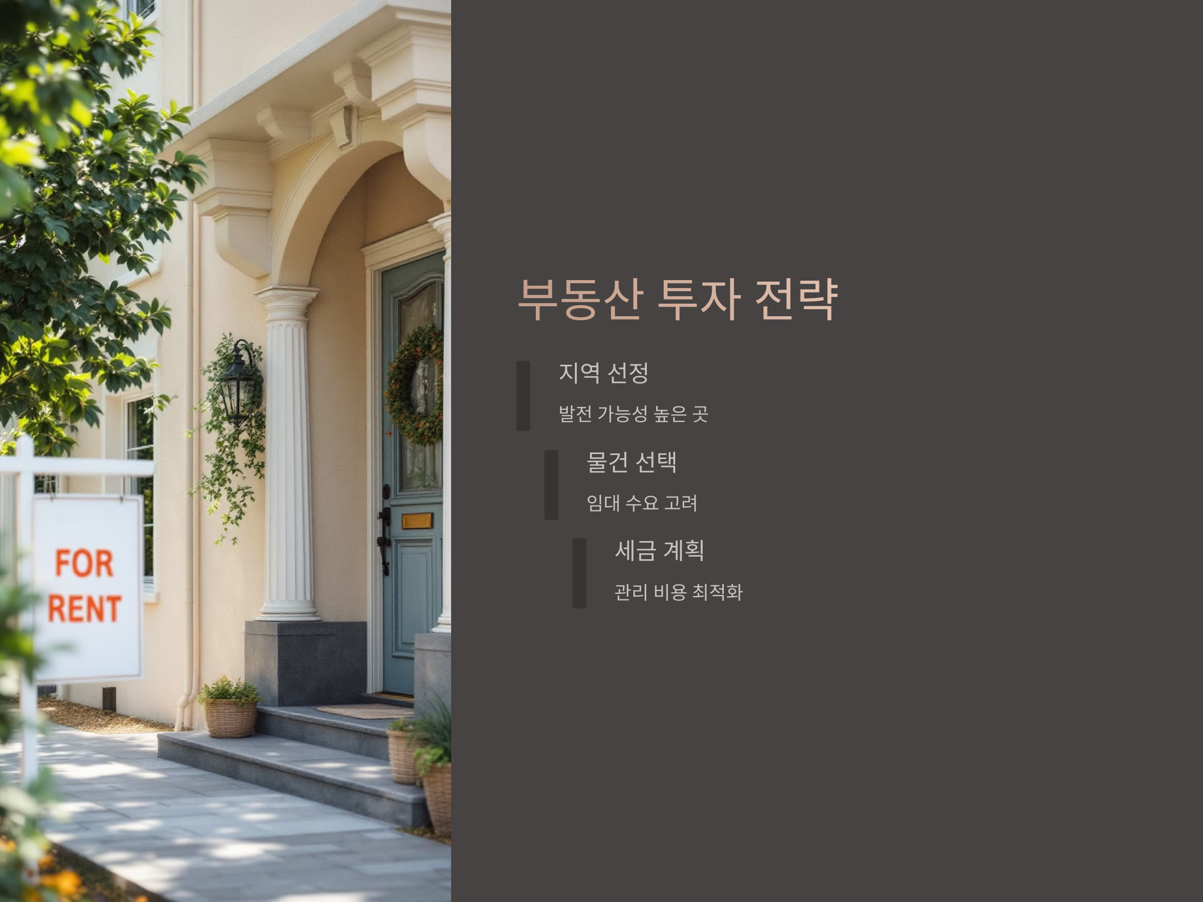 부동산 투자는 초기 자본이 많이 들어가지만, 제대로 된 지역과 물건을 선택하면 안전하게 수익을 얻을 수 있습니다. 또한, 부동산 매매와 관련된 세금이나 관리 비용 등을 미리 고려하여 수익을 최적화하는 전략이 필요합니다.