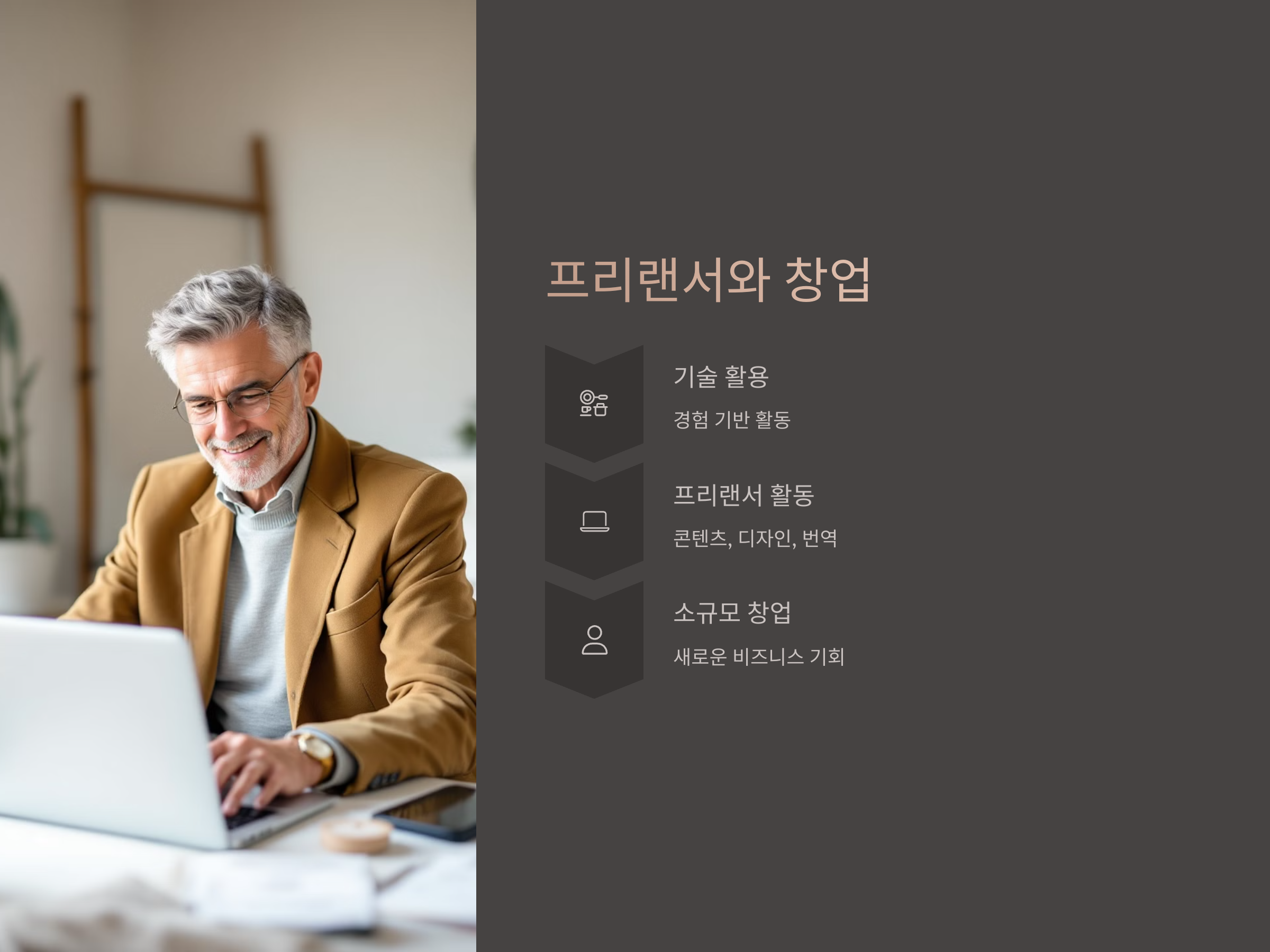 퇴직 후 경제적 독립을 이루기 위한 또 다른 방법은 프리랜서 활동이나 창업입니다. 자신이 가진 기술이나 경험을 활용해 프리랜서로 일하거나, 소규모 창업을 통해 수익을 창출할 수 있습니다. 예를 들어, 콘텐츠 제작, 디자인, 번역, 글쓰기와 같은 분야에서 프리랜서로 활동하면서 안정적인 수입을 얻을 수 있습니다.