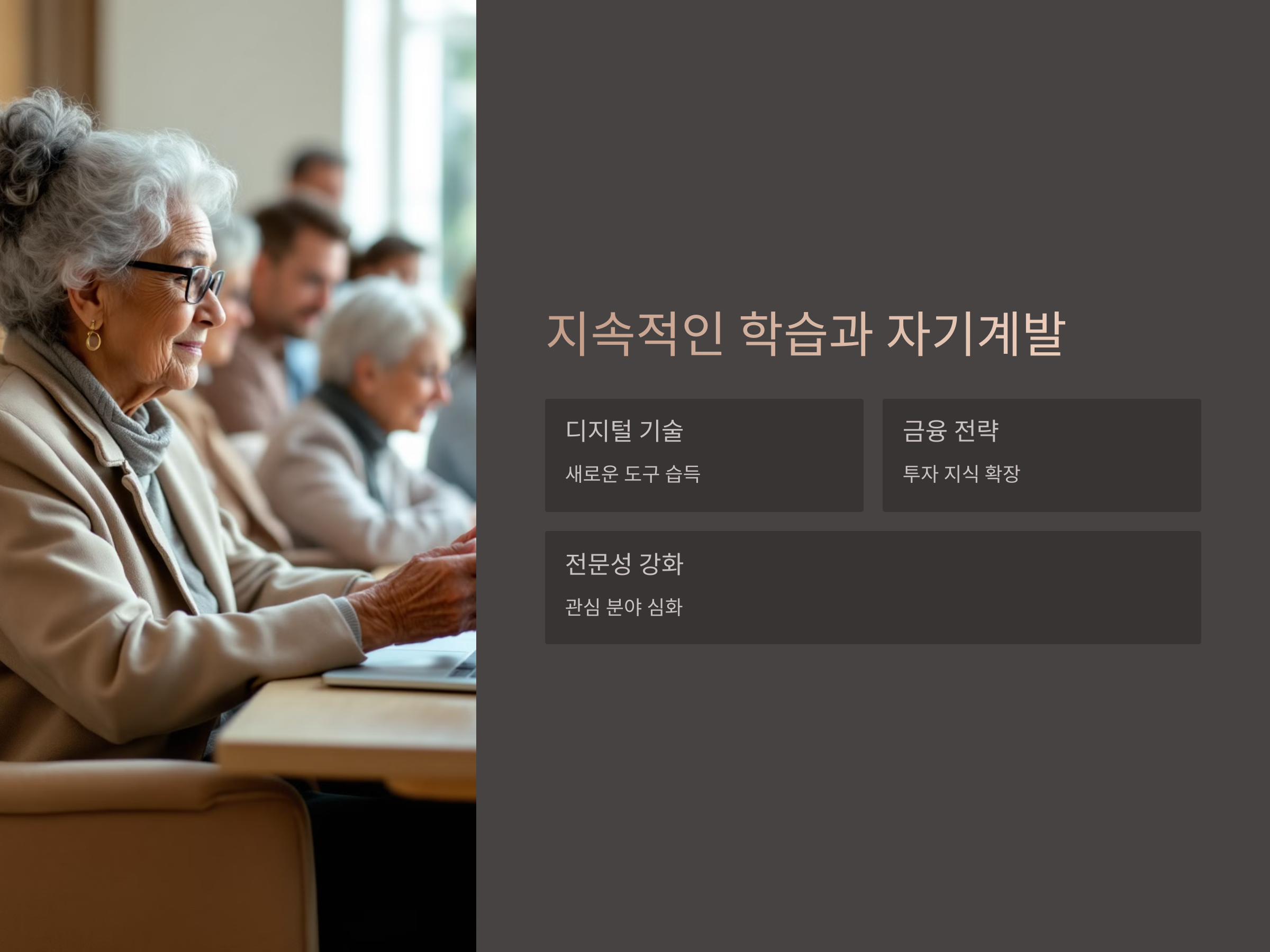 퇴직 후 경제적 독립을 위해서는 지속적인 학습과 자기계발이 필수적입니다. 기술이 빠르게 발전하고, 경제 환경도 변하기 때문에, 변화에 적응할 수 있는 능력을 키우는 것이 중요합니다. 예를 들어, 디지털 기술을 배우거나, 새로운 금융 전략에 대해 학습하는 것이 도움이 될 수 있습니다.