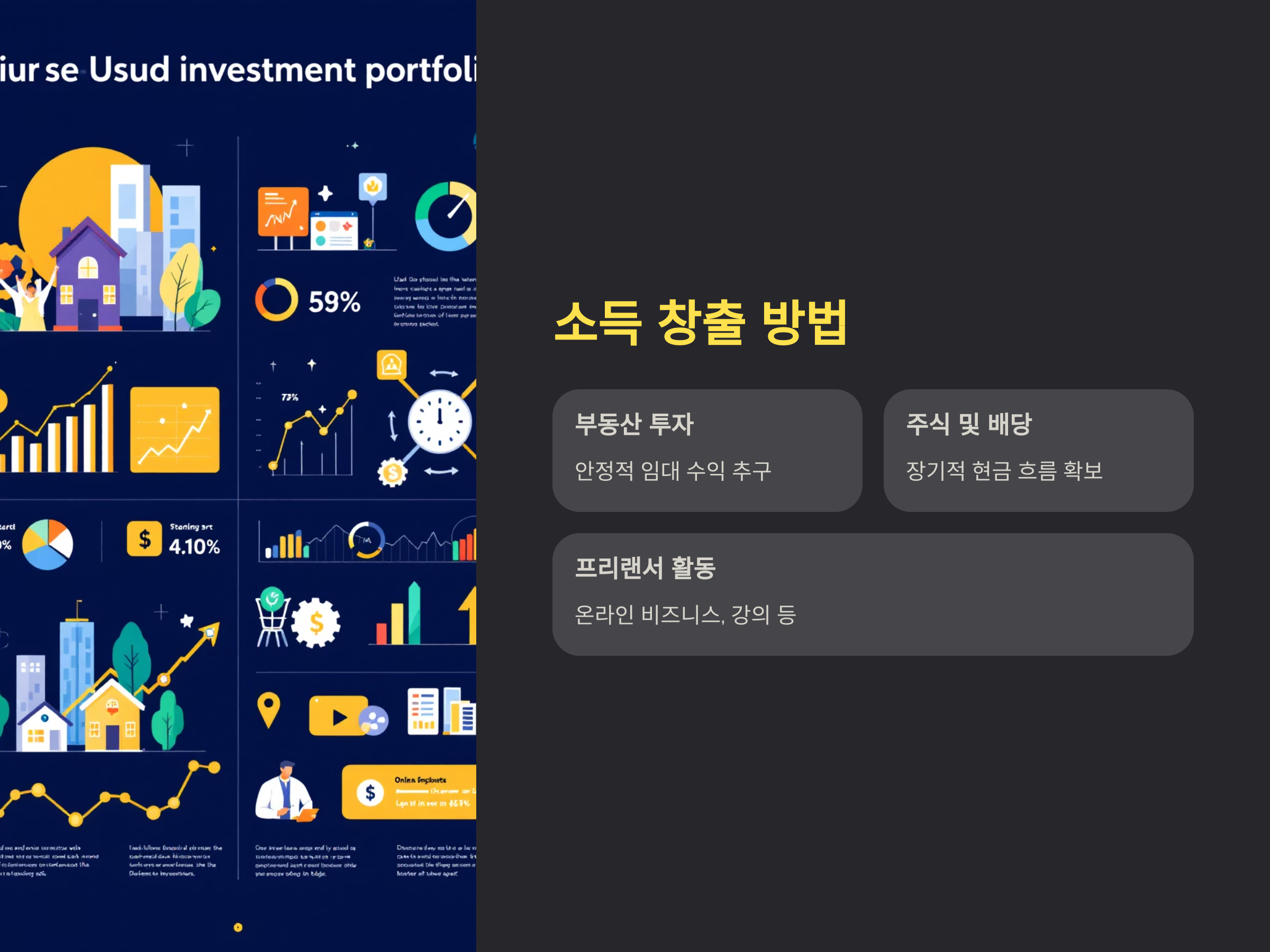 퇴직 후, 고정 수입이 끊어지므로 수익을 창출할 수 있는 방법을 모색해야 합니다. 예를 들어, 퇴직 후 부동산 임대 수익을 고려할 수 있습니다. 또한, 주식 배당금이나 펀드 수익, 혹은 프리랜서 일을 통해서도 일정한 현금 흐름을 확보할 수 있습니다.