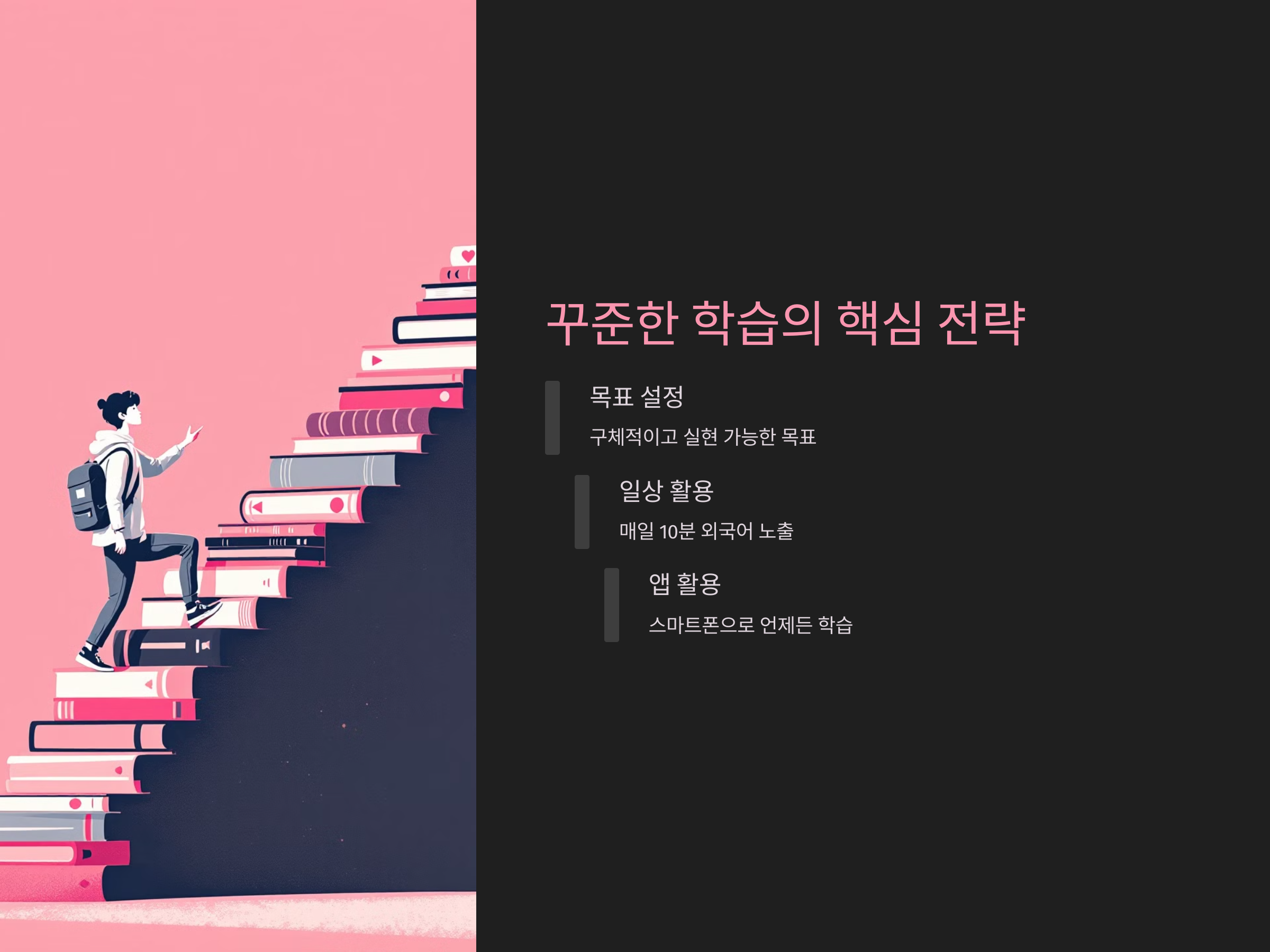 큰 목표를 설정하는 것도 중요하지만, 작은 목표를 설정하여 달성할 때마다 성취감을 느끼는 것이 중요합니다. 예를 들어, 매일 새로운 단어 5개씩 외우기, 주마다 한 편의 외국어 영화를 완주하기 등 구체적이고 실현 가능한 목표를 세워보세요.